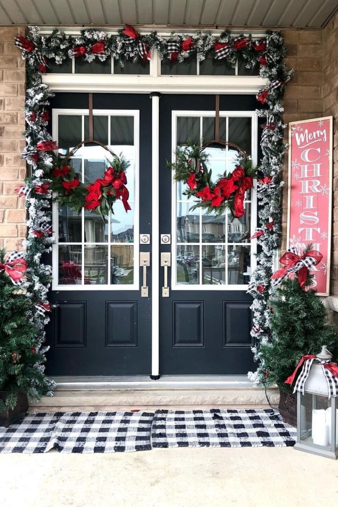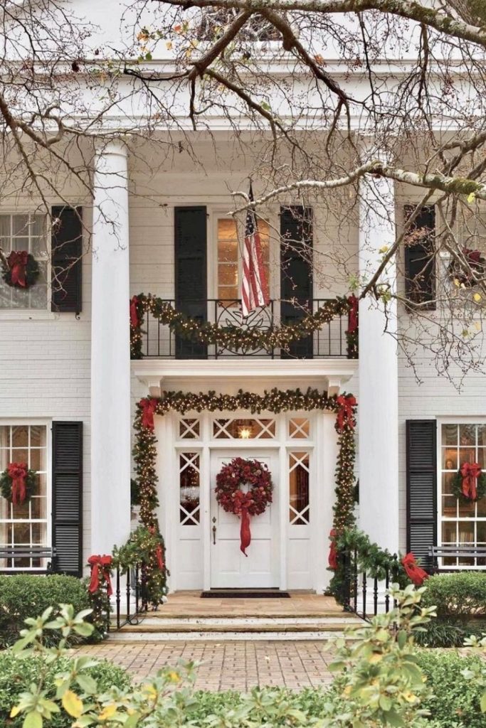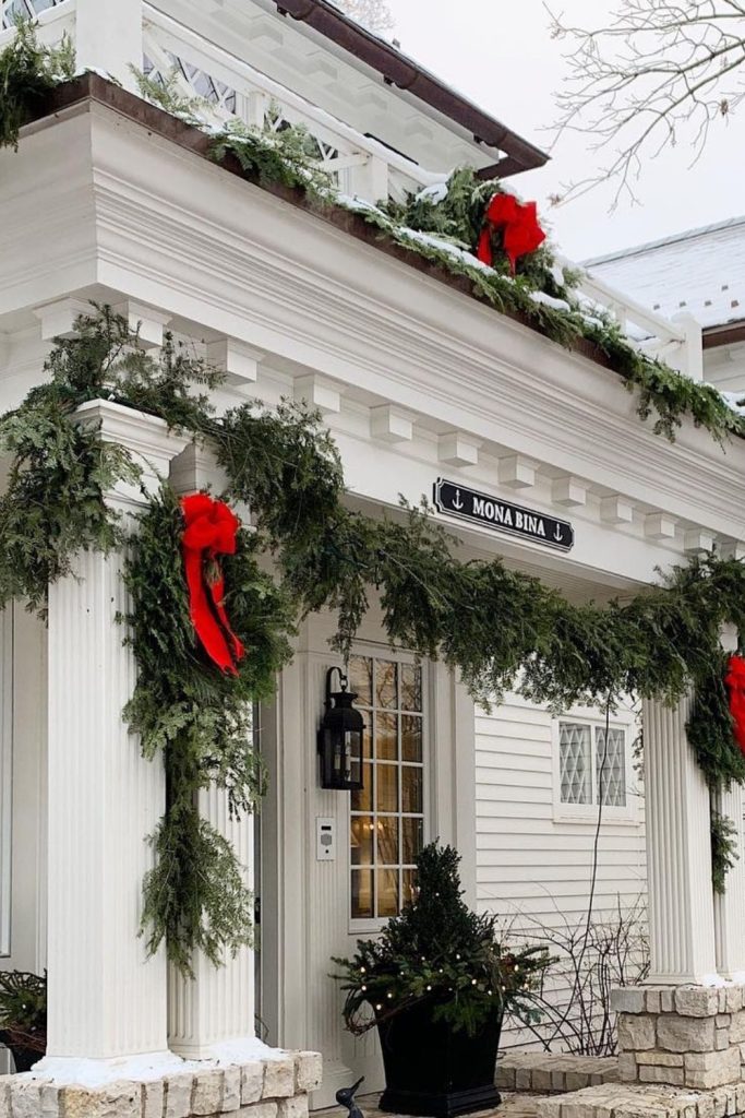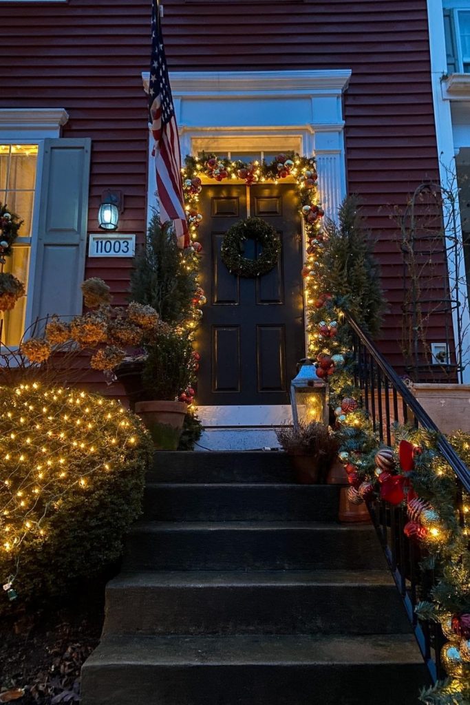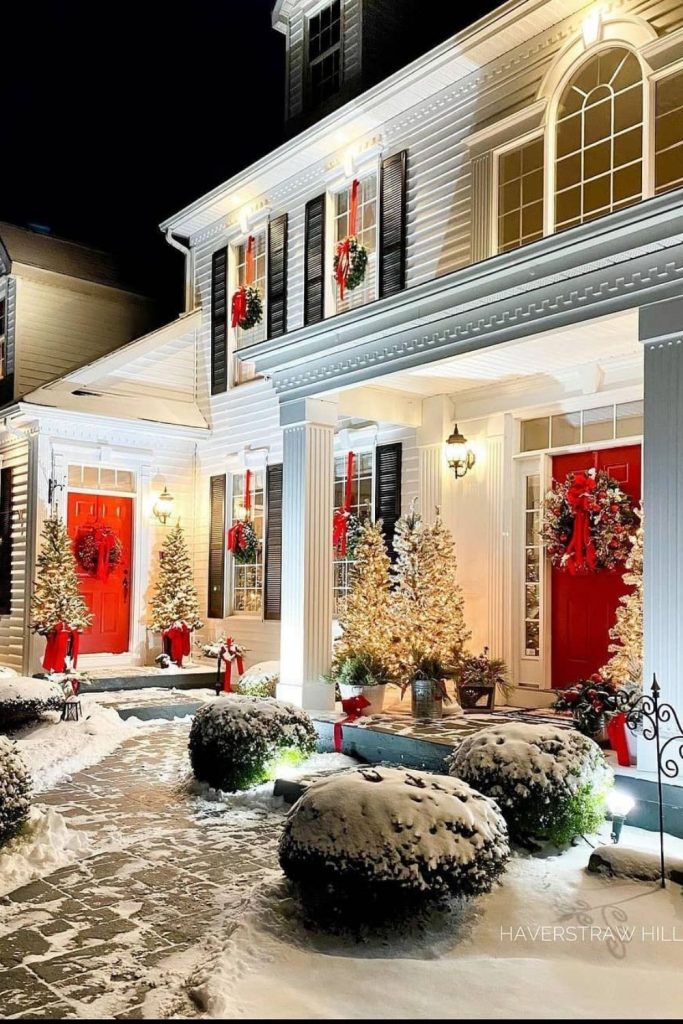 This porch nails classic Christmas vibes! A vibrant red wreath with a buffalo check bow hangs proudly on the door, complemented by lush garlands draped over the railing. Potted evergreens flank the steps, adorned with tiny gold ornaments for a festive sparkle. The rich red and green palette feels timeless yet fresh, perfect for holiday gatherings. I love how the natural elements keep it eco-friendly. Want to try this look? Mix in some heirloom pieces for extra charm. Drop your favorite holiday color combo below and pin this for your outdoor decor ideas!