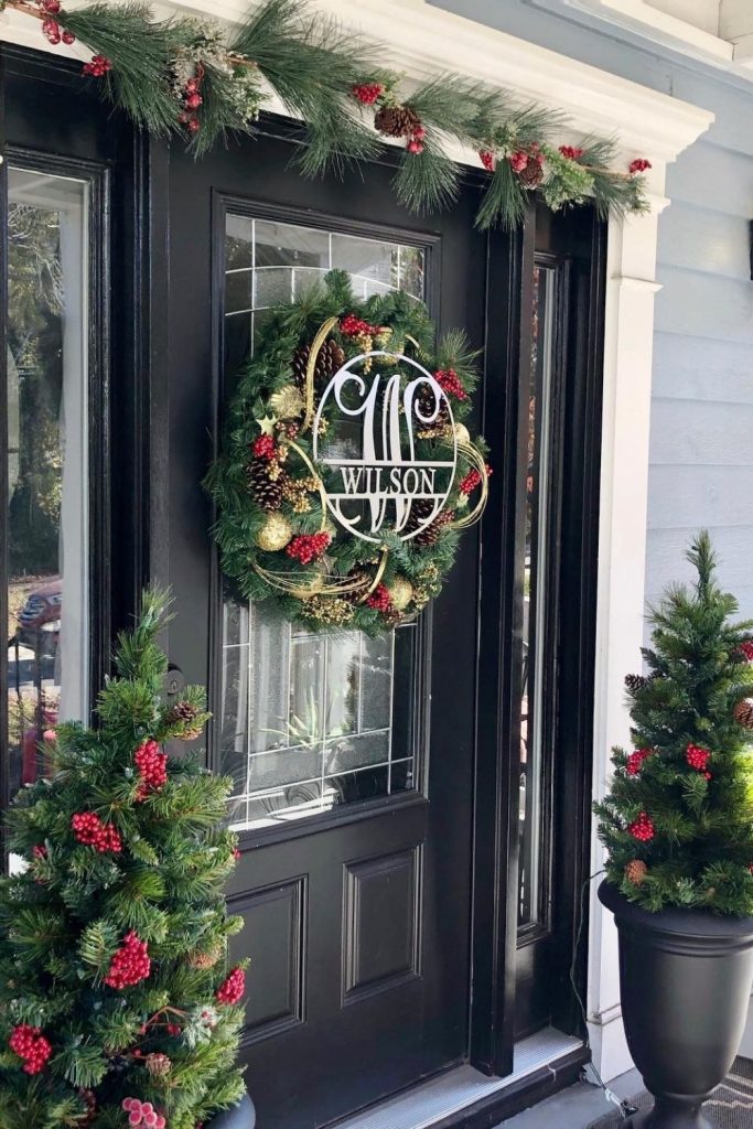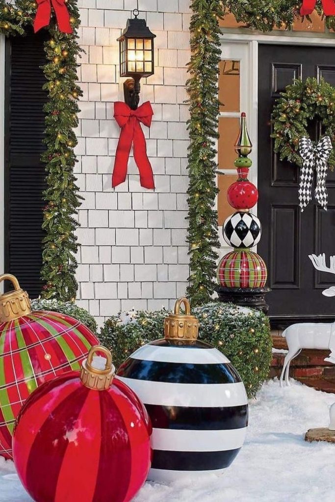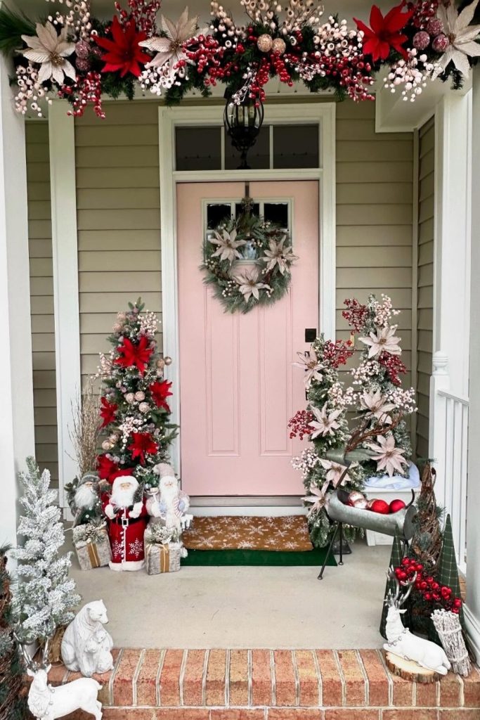 This porch is an eclectic delight! A colorful wreath with dried citrus and ribbons hangs on the door, paired with mismatched lanterns and potted evergreens. The mix of textures and sustainable materials creates a vibrant, welcoming vibe. I love how this setup feels so personal—perfect for showcasing your unique style. Try mixing thrift-store finds for charm! What’s your eclectic decor tip? Pin this for your Christmas decor ideas outdoor and share your bold holiday ideas below!
