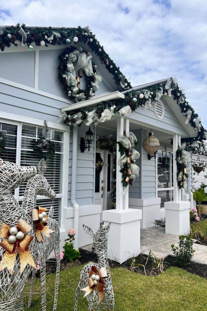 This porch rocks a sleek, modern vibe! A black-and-white color scheme shines with a minimalist wreath of white berries and a garland of frosted pinecones. Solar-powered lanterns add a sustainable glow, perfect for evening ambiance. The clean lines and neutral tones feel fresh and trendy, ideal for a contemporary holiday look. I’m loving how less can be so striking! Try painting old decor black for a modern twist. What’s your take on monochrome decor? Save this for your Christmas decor ideas outdoor and share your thoughts below!