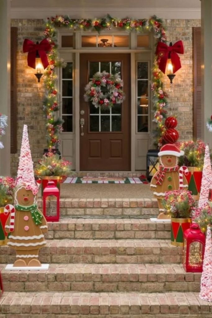 This porch radiates warmth! A trio of lanterns with flickering candles sits on the steps, surrounded by lush garlands and red berry accents. The soft glow and natural textures create a cozy, inviting vibe perfect for holiday evenings. I love how sustainable materials like pine and burlap keep it eco-conscious. Want this look? Mix lantern sizes for depth! What’s your favorite way to light up your porch? Save this for your Christmas decor ideas outdoor and share your cozy setup ideas below. Let’s make your porch glow!