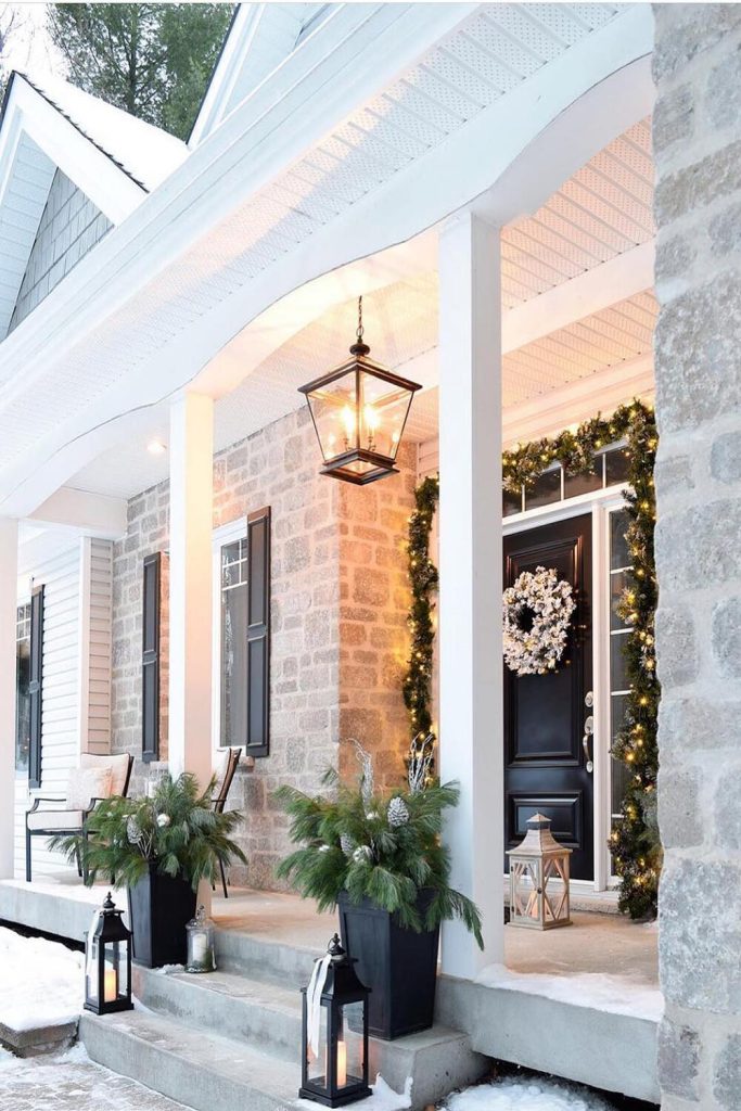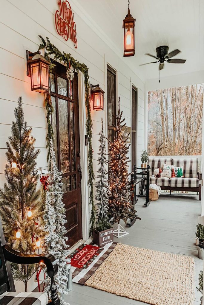 This porch is a holiday classic! A lush garland with red ribbons and a traditional wreath create a warm, inviting entry. The soft glow of lanterns adds cozy charm, perfect for 2025’s timeless trends. I’d add a festive doormat for extra cheer, as this setup feels like Christmas morning. It’s ideal for a welcoming holiday vibe. Love traditional decor? Recreate this look and share your classic porch ideas in the comments to inspire others!
