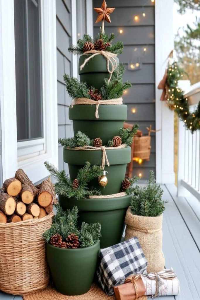 This porch feels like a warm hug! A woven basket filled with greenery and a simple wreath create a natural, inviting look. Soft lanterns and a plaid throw add cozy charm, aligning with 2025’s sustainable decor trends. I’d add a wooden star for a whimsical touch, as this setup is all about warmth. It’s perfect for a welcoming holiday vibe. Want a natural porch look? Recreate this and share your eco-friendly decor tips in the comments to inspire others!