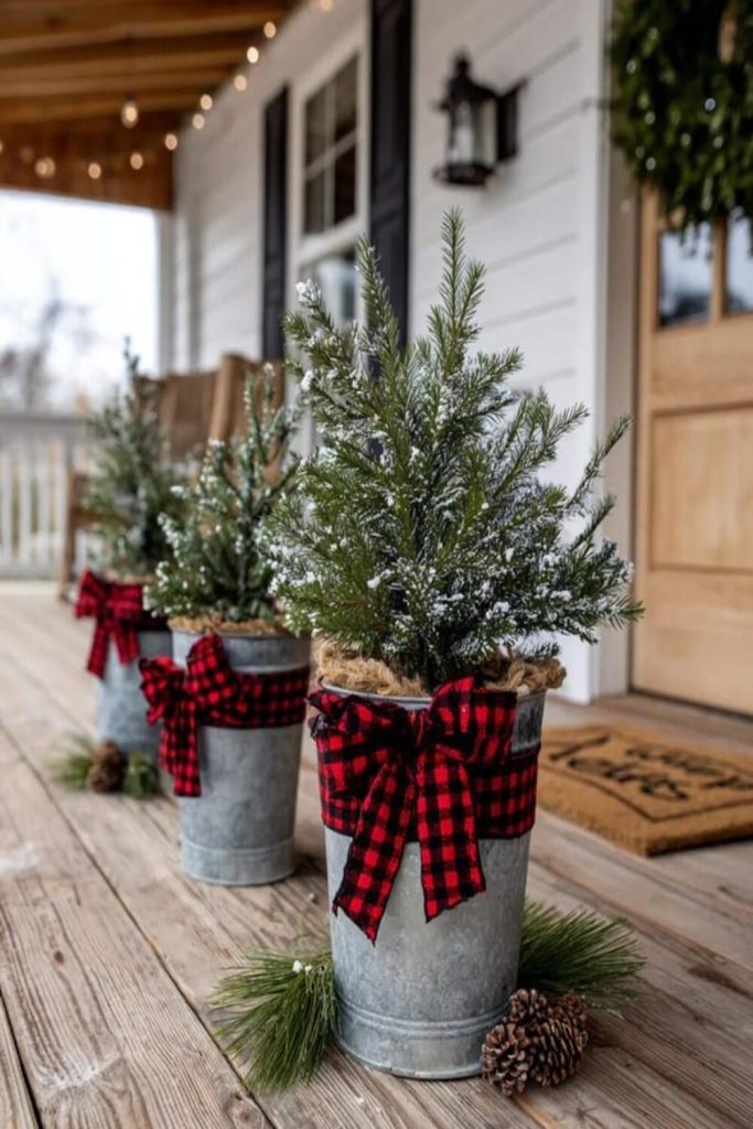 This farmhouse porch is holiday perfection! A galvanized bucket filled with greenery and a plaid-wrapped wreath create a rustic, welcoming vibe. Soft fairy lights add a cozy glow, perfect for 2025’s sustainable trends. I’d add a wooden sign for extra charm, as this setup feels like home. It’s ideal for creating a warm holiday entry. Love farmhouse style? Recreate this look and share your rustic decor tips in the comments to spark more holiday ideas!