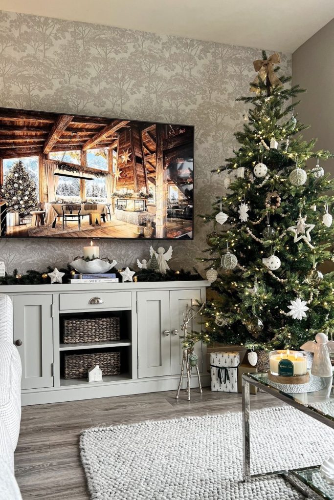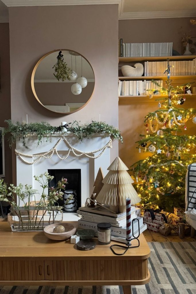 This Scandinavian nook is pure holiday bliss! A sleek wooden chair is draped with a sheepskin throw, next to a minimalist tree adorned with simple wooden ornaments. The neutral palette—whites, grays, and natural wood—feels fresh and serene. I’ve always loved how Scandi style balances simplicity with coziness, perfect for a Christmas decor refresh. To recreate this, focus on clean lines and natural textures. What’s your take on minimalist holiday decor? Save this idea for your own cozy corner and let me know your thoughts in the comments!