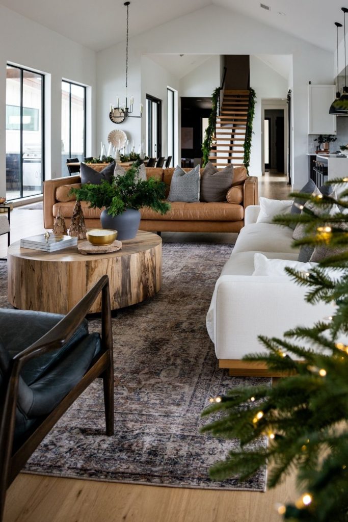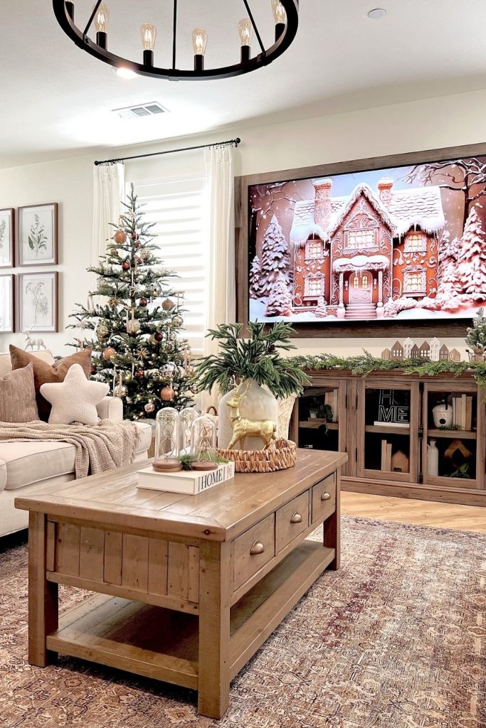 This living room is boho holiday perfection! A woven rug anchors a cozy sofa piled with textured pillows in earthy tones. A small tree with handmade ornaments adds charm. I love how this space mixes eclectic vibes with festive warmth—perfect for relaxed holiday gatherings. Use natural fibers and personal touches for a similar look. What’s your favorite boho holiday decor trick? Save this for your living room refresh and drop your ideas in the comments!