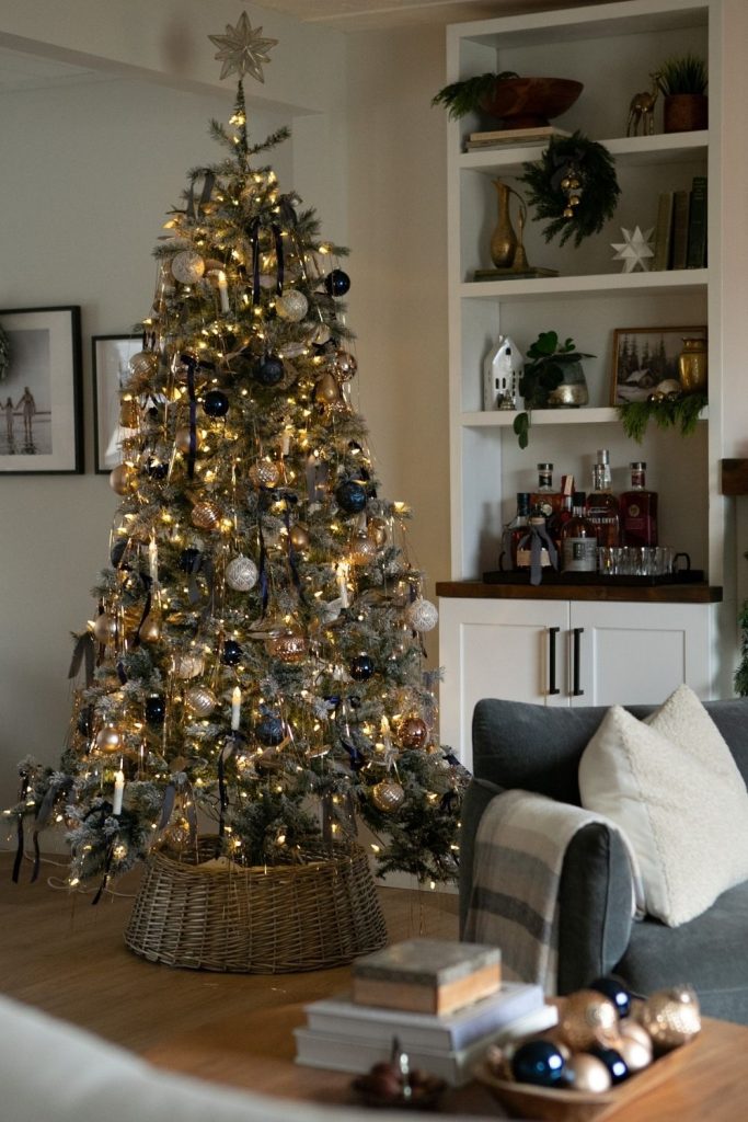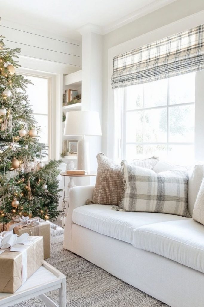 This sleek setup is all about cozy minimalism! A small, potted Christmas tree sits on a clean white shelf, decorated with delicate glass ornaments in neutral tones. The soft beige throw and plush cushions add warmth without overwhelming the space. I love how this look proves less is more—perfect for small apartments or modern homes. The key is choosing a few high-quality pieces in a winter palette like ivory or taupe. Want to recreate this vibe? Start with a simple tree and layer in soft textures. Share your minimalist decor tips below!