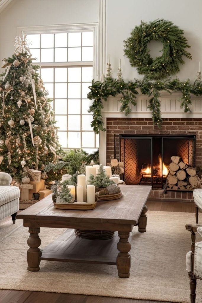 This fireplace setup is minimalist magic! A simple garland of pine and eucalyptus drapes across the mantel, paired with a few white candles and a single star ornament. The neutral palette keeps it serene yet festive. I’m all about this less-is-more approach—it’s sustainable and chic. To recreate this, focus on one or two natural elements for impact. What’s your favorite way to style a holiday mantel? Save this for your next decor project and let me know your thoughts in the comments!