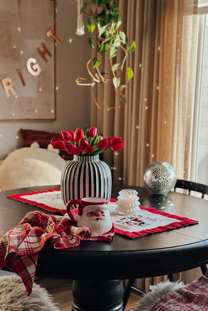 This tablescape is a vintage holiday gem! A rustic wooden table is set with mismatched china, gold-rimmed glasses, and a lush garland centerpiece. The warm candlelight and tartan napkins add nostalgic charm. As a decor lover, I’m all about mixing old and new for a timeless holiday feel. Use heirloom pieces or thrifted finds to create this look on a budget. It’s sustainable and full of character! How do you style your holiday table? Pin this for your next dinner party and share your favorite table decor ideas below!
