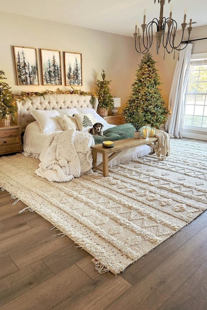 This bedroom is a holiday haven! A plush throw in deep burgundy drapes over a crisp white bed, paired with pinecone accents and a tiny tabletop tree. The soft lighting from a woven lantern adds a warm glow. As a decor enthusiast, I love how this space feels like a cozy escape with minimal effort. Stick to a seasonal palette of reds and greens for that festive touch. Want this vibe? Add textured throws and small greenery to your bedroom. What’s your favorite way to make your bedroom festive? Pin this for inspiration!
