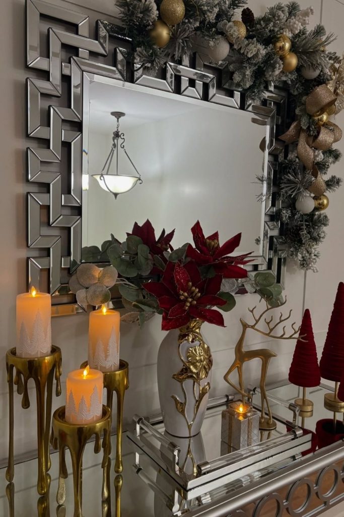This entryway is modern holiday chic! A sleek console table holds a minimalist wreath and a cluster of metallic candles. The black-and-white palette feels fresh yet festive. As a decor lover, I adore how this setup balances simplicity with holiday spirit. To get this look, focus on clean lines and a few bold accents. How do you style your entry for the holidays? Save this for your next decor refresh and share your entryway decor tips in the comments!
