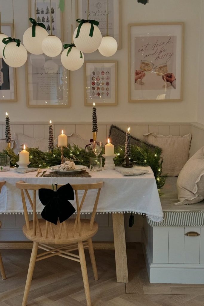This cozy setup screams rustic Christmas magic! A wooden dining table is adorned with a simple linen runner, paired with woven placemats and fresh pine sprigs. The soft glow of taper candles in earthy tones adds warmth, while a minimalist wreath hangs as a focal point. As a decor lover, I adore how this look blends sustainable materials with festive vibes. It’s perfect for a holiday gathering that feels intimate and grounded. Try incorporating natural textures like burlap or wood into your own space for that effortless, cozy charm. What’s your favorite holiday table style?