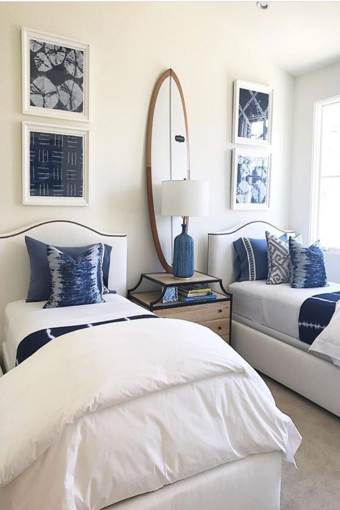 This bedroom screams coastal chic with its bold blue accents against a crisp white base. The striped throw and navy pillows pop, while the weathered wood nightstand keeps it grounded. I love the balance of vibrant color and natural textures—it’s lively yet relaxing. To get this look, mix bold ocean hues with neutral linens and add a rustic touch. It’s all about creating that beachy vibe with personality. What’s your favorite coastal color combo? Pin this for your next bedroom refresh and share your decor ideas in the comments to inspire others!