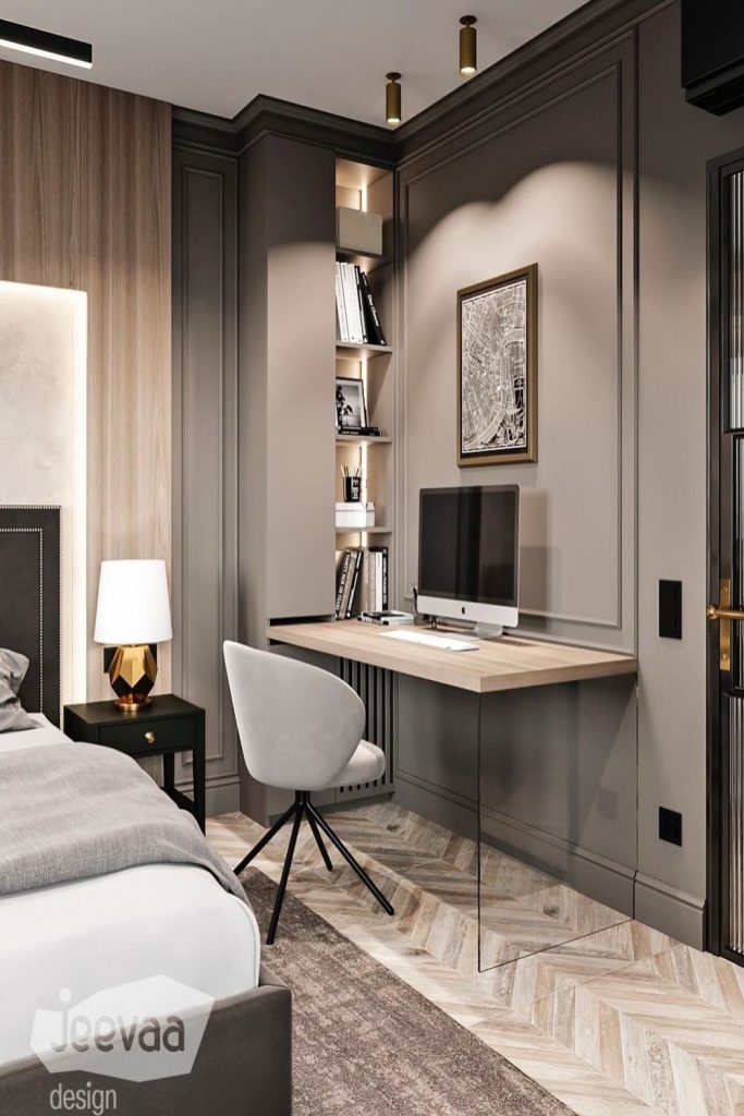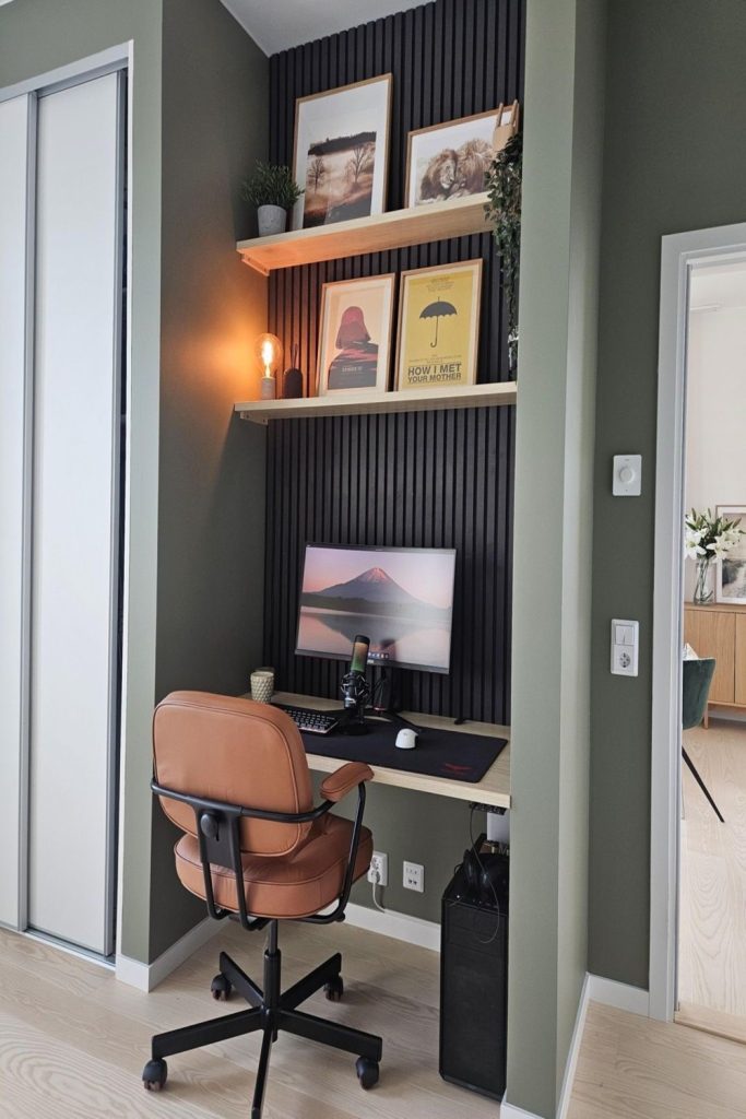 This art deco desk setup is pure sophistication! A glossy black desk with gold accents pairs with a plush chair in deep teal. Geometric decor and a sleek mirror add drama without clutter. As a decor lover, I’m obsessed with how this blends bold luxury with function. Perfect for a glamorous home office! Want this style? Pin it for inspo. Share your favorite art deco piece in the comments to spark ideas.