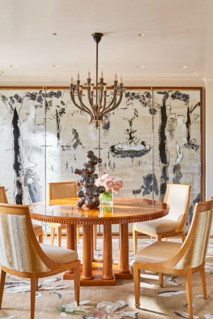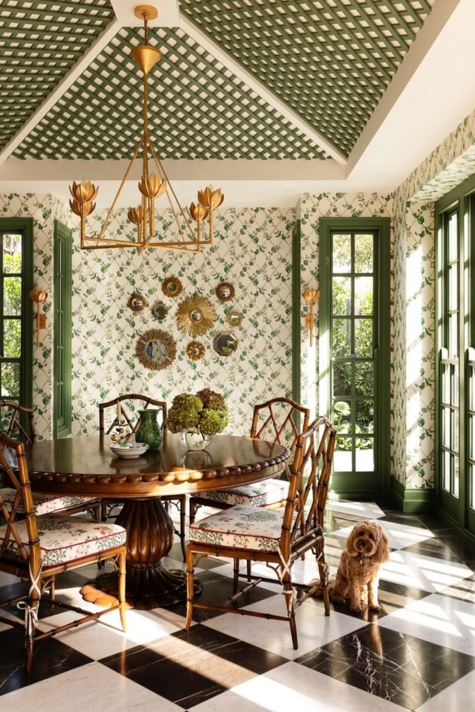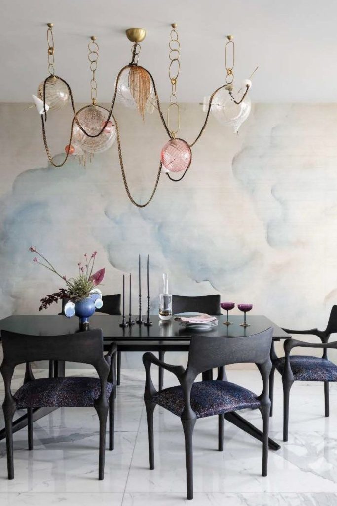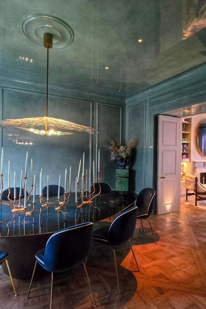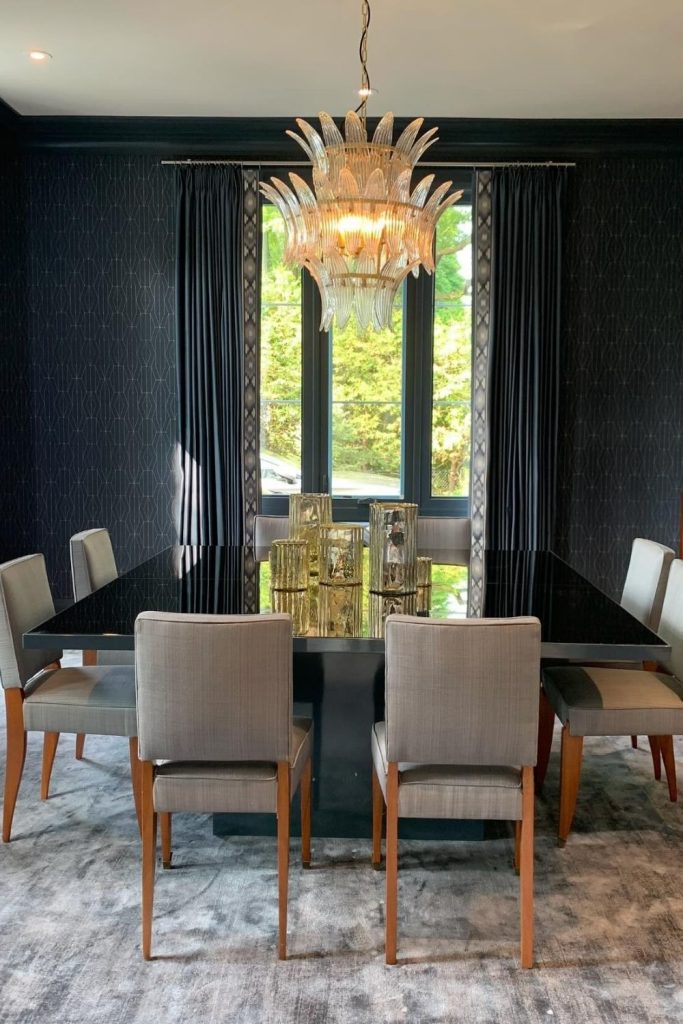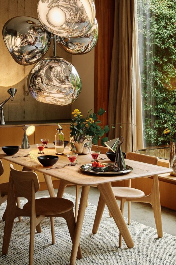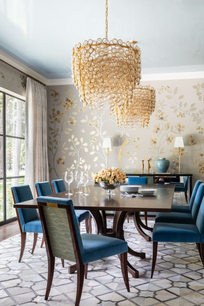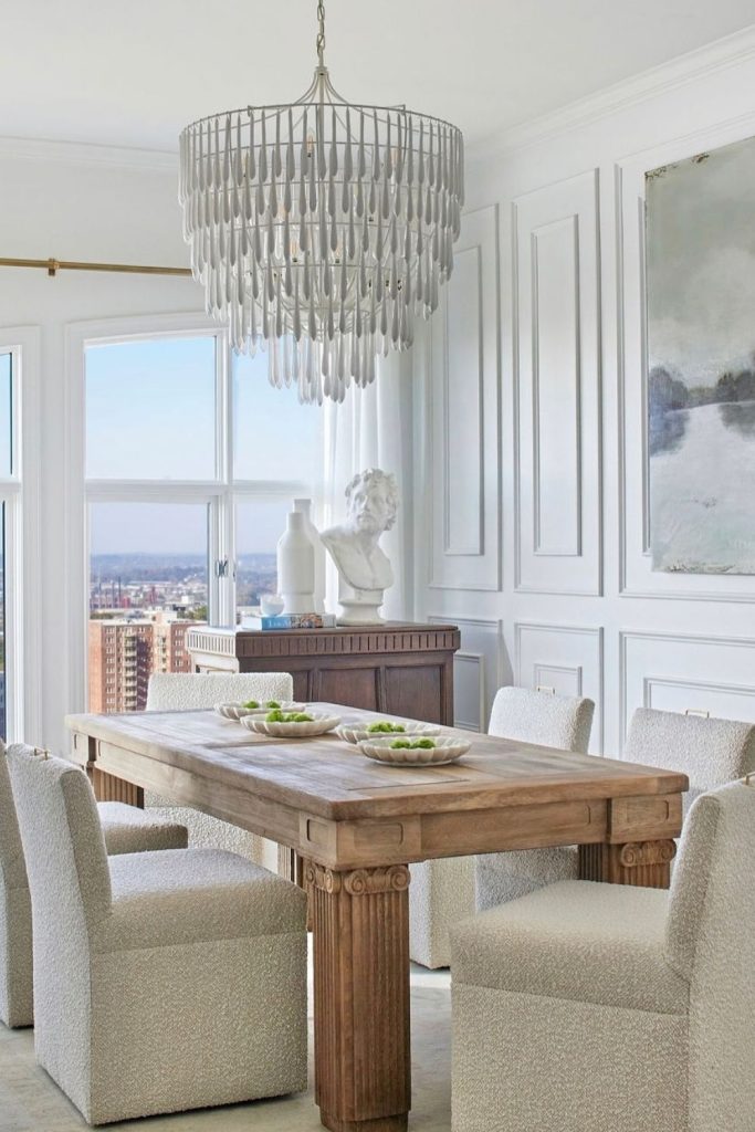This dining room looks fancy. A geometric chandelier hangs above. Its bold lines match velvet chairs. The light feels warm. The chandelier adds drama but not too much. Want Art Deco? Use bold shapes. Pin this and share ideas!