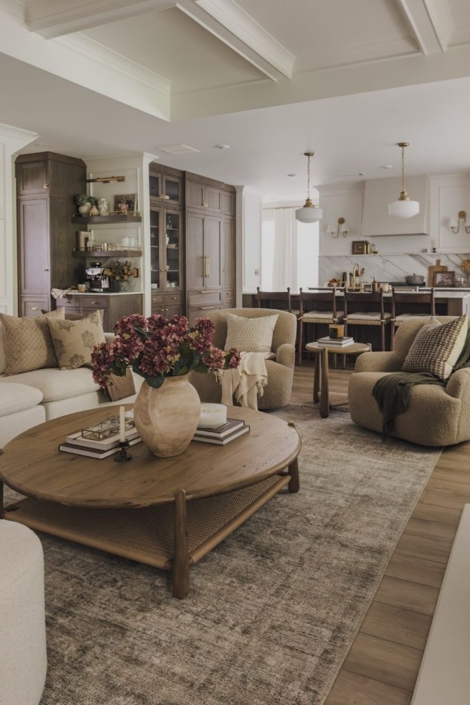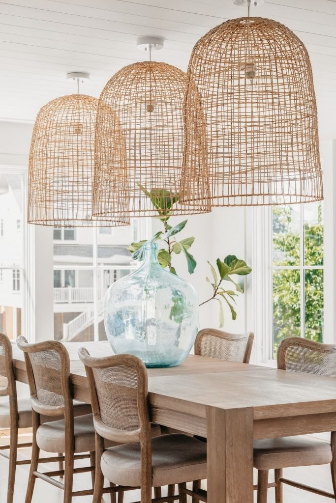This room feels natural. Woven lights hang above the table. Soft glow and wood textures feel warm. Linen chairs add comfort. The lights add texture and charm. Want nature inside? Use woven lights. Pin this and share ideas!