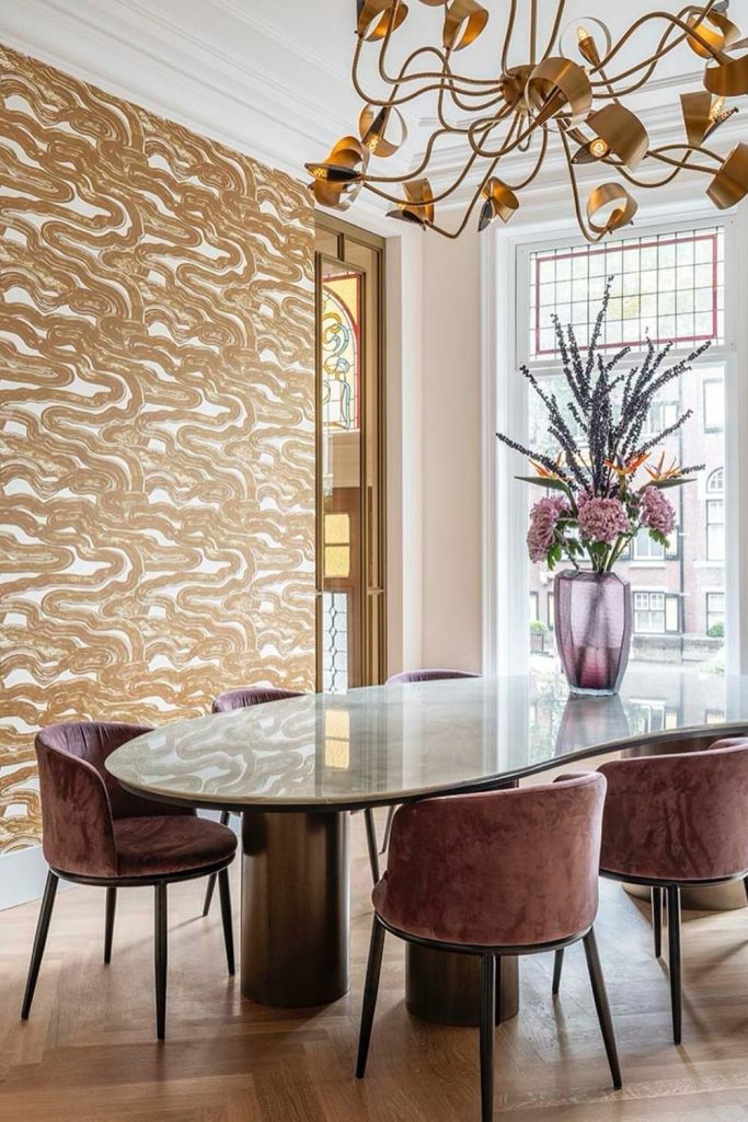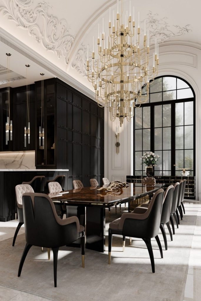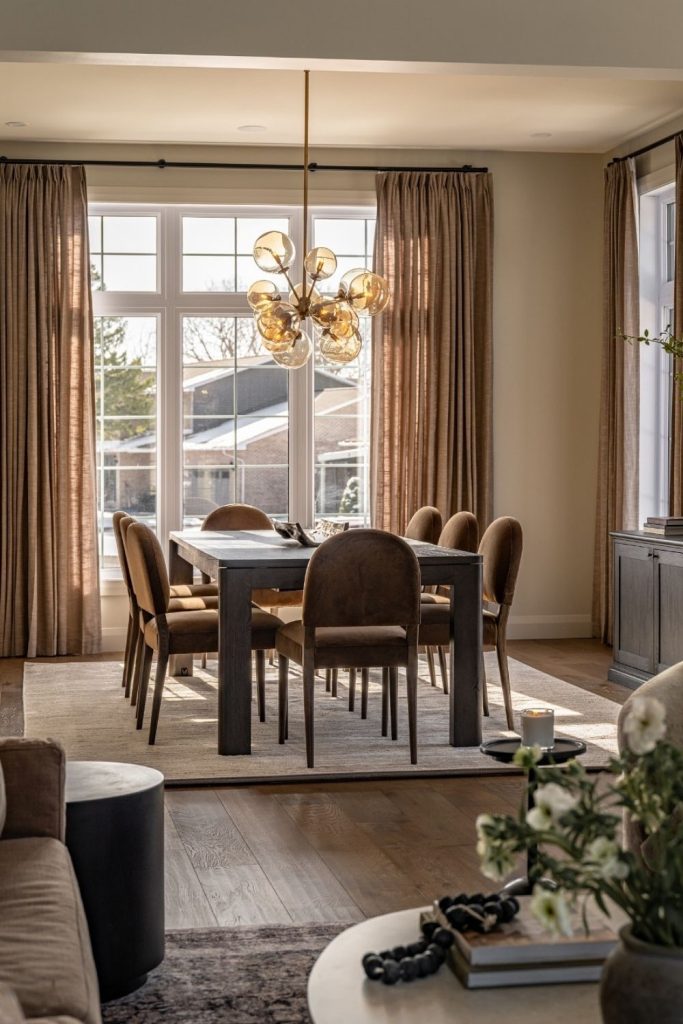 This dining space feels rich and fancy. A golden chandelier shines over velvet chairs and a marble table. The light is warm and soft. The chandelier is bold but not too much. Try gold or metal for a timeless look. Pin this and share your glam tips!