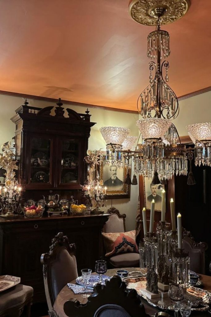 This dining room is classic and elegant. A crystal chandelier shines over a wooden table and soft chairs. The light is warm and nice. It mixes old-world charm with modern style. Want vintage glamour? Pin this and share your tips!