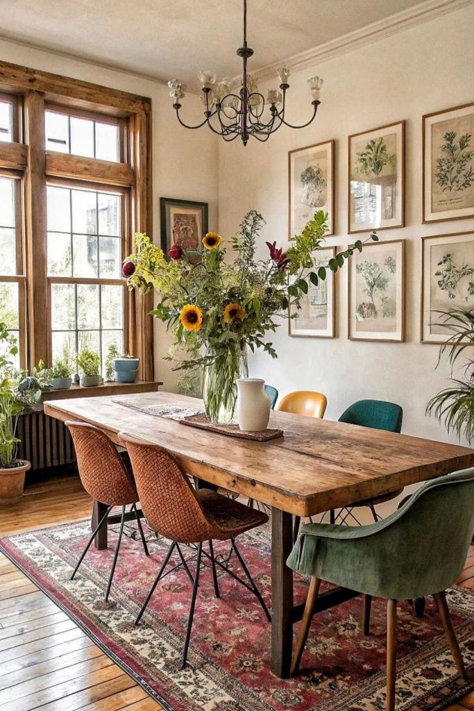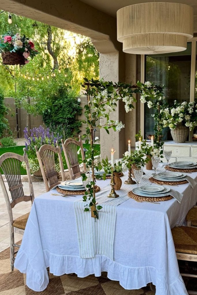 This centerpiece is full of color and texture. A woven basket holds wildflowers and green plants. A colorful runner adds impact. The look feels free and fun but intentional. It is great for summer meals or casual brunches. Use bold blooms for a lively table. Pin this and share your favorite boho touches!