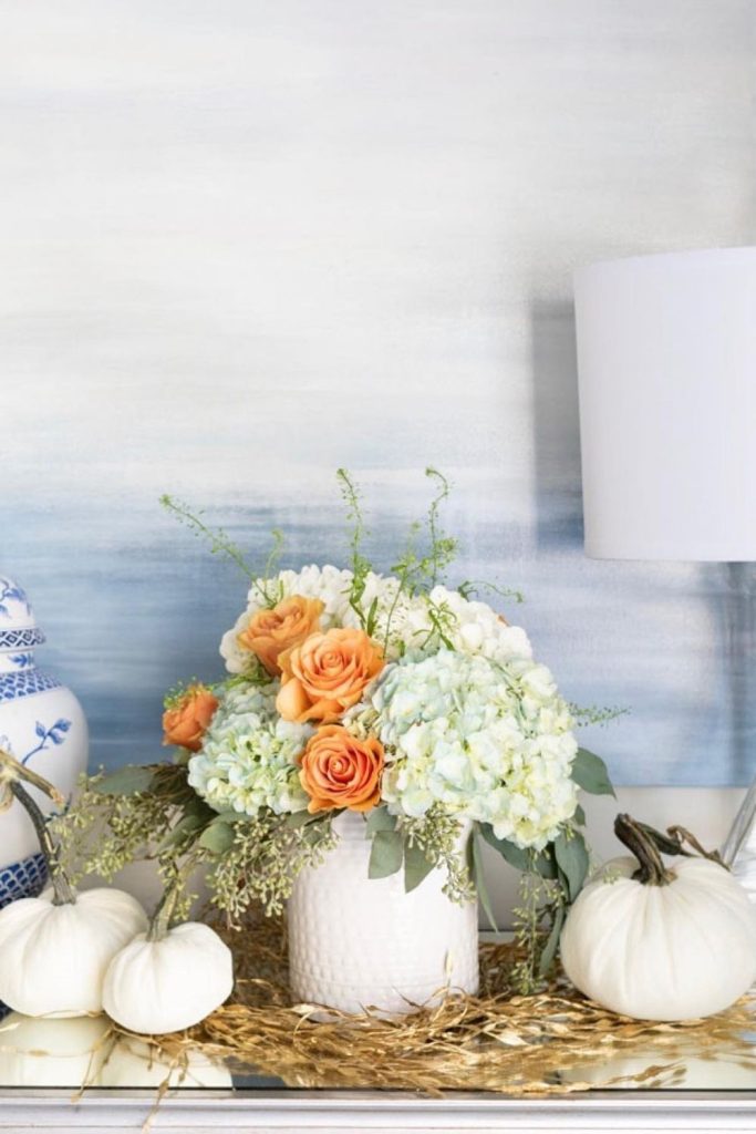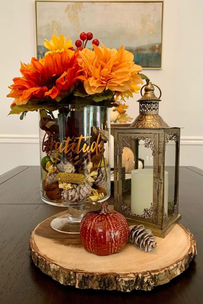 This centerpiece is simple but stunning. A ceramic vase holds dried wheat and orange blooms. A neutral runner keeps it calm. The look blends cozy minimalism with autumn charm. It is perfect for fall meals. Simple elements make a big impact. Pin this and share your minimalist fall ideas!