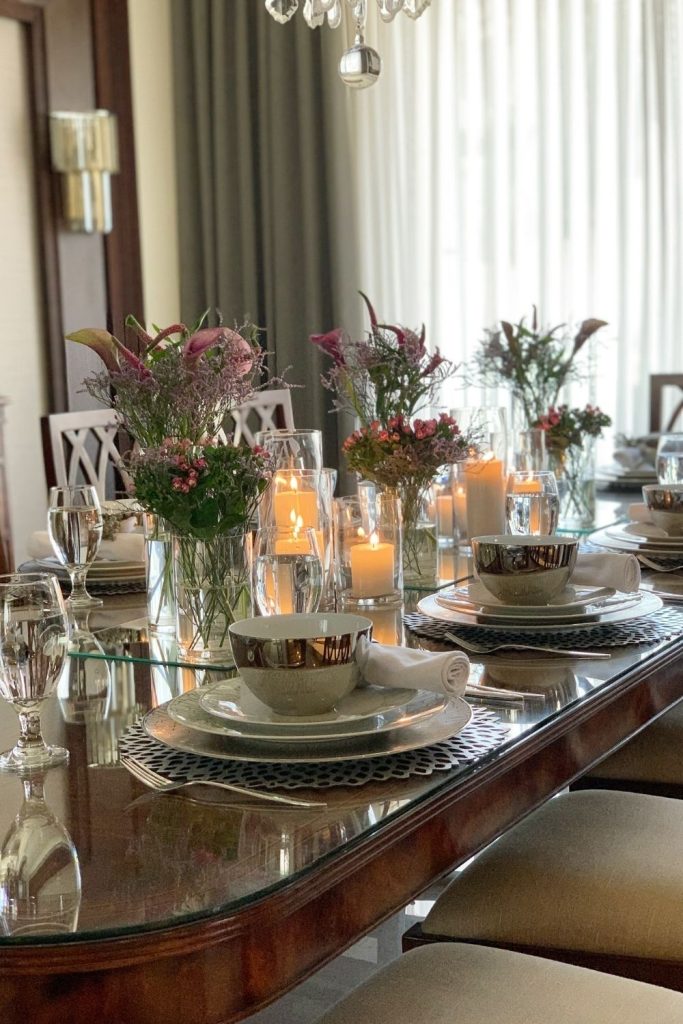 This centerpiece sets a cozy mood. A wooden tray holds candles, roses, and lavender. The textures and blooms feel warm and inviting. It is perfect for date nights or intimate dinners. Candlelight adds instant romance. Try mixing flowers and candles for your own look. Pin this and share your romantic table ideas!