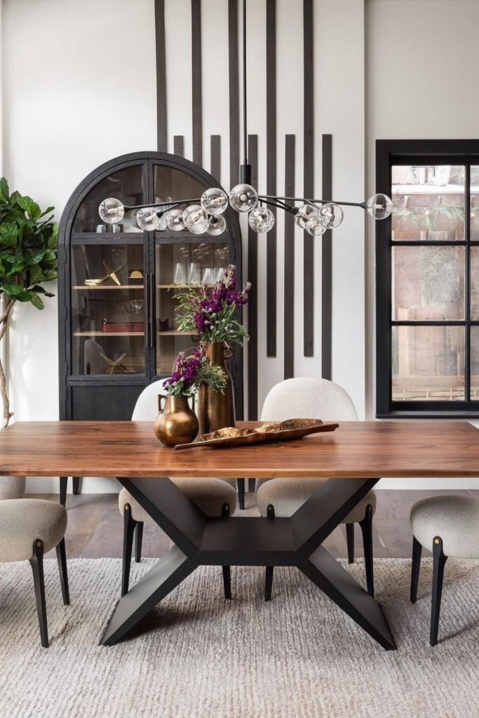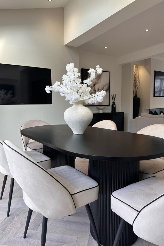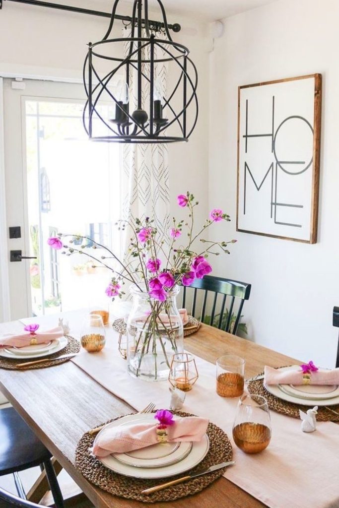 Less is more here. A black vase with white flowers sits on a linen runner. The look is clean and modern. Simple colors feel fresh and timeless. It works in any season—just swap flowers. Try this for a chic dinner vibe. Pin it and share your minimalist ideas!