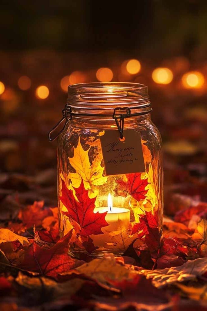 1. Cozy Autumn Leaf Mason Jar Lanterns on a Rustic Mantle