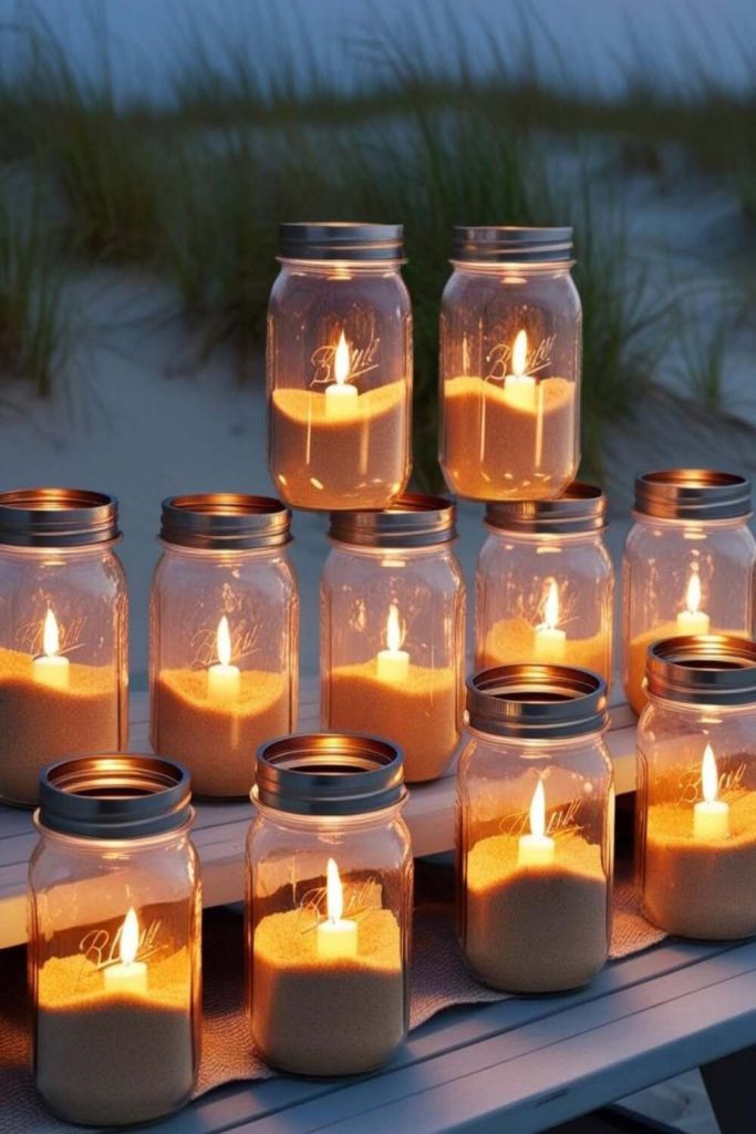 8. Beachside Sand-Filled Candlelit Mason Jar Luminaries