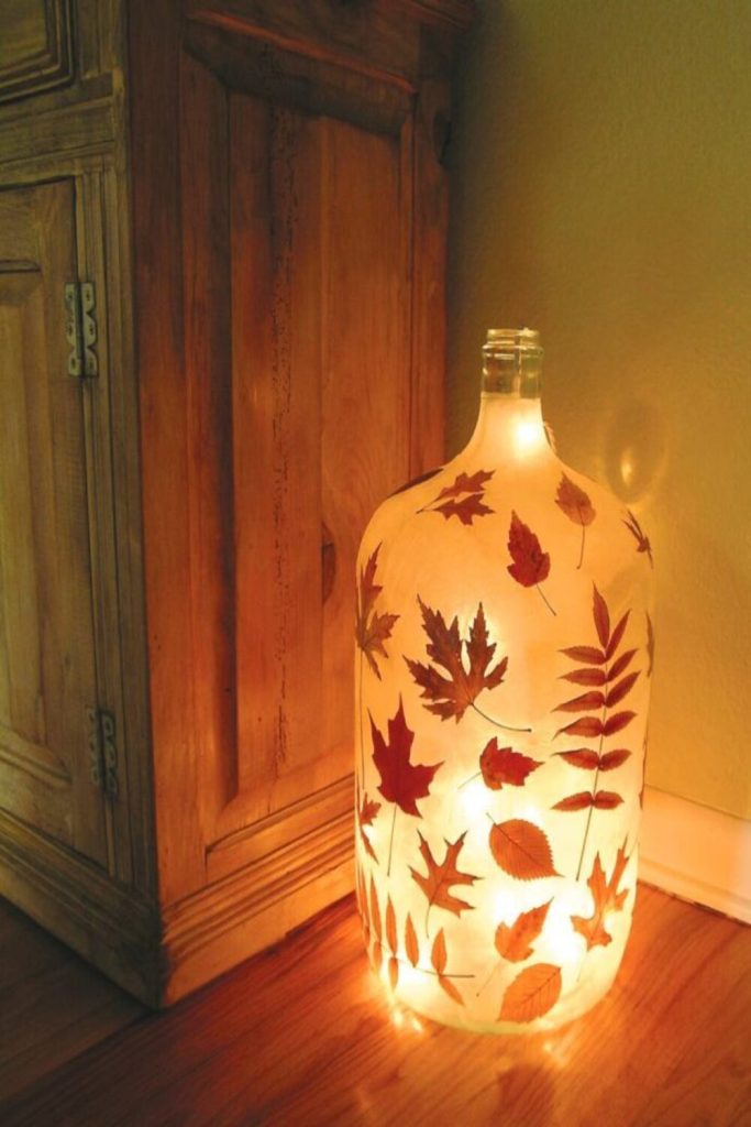 I got many empty bottles one weekend. That was a big win! This tall light stands by a wood shelf. I glued maple leaves on its side. The leaves are bright red and gold. Fairy lights shine inside. They look like small fireflies. I put a clear coat on the leaves. This made them shiny and rain-safe. I learned this trick after a rainy day. This light is a great rustic stand-in. Use it for big rooms. It mixes boho and fall looks well. The soft glow warms any spot. It is nice on cold nights with a book. Use battery-powered lights to move it easily. How do you reuse bottles? Let’s chat!