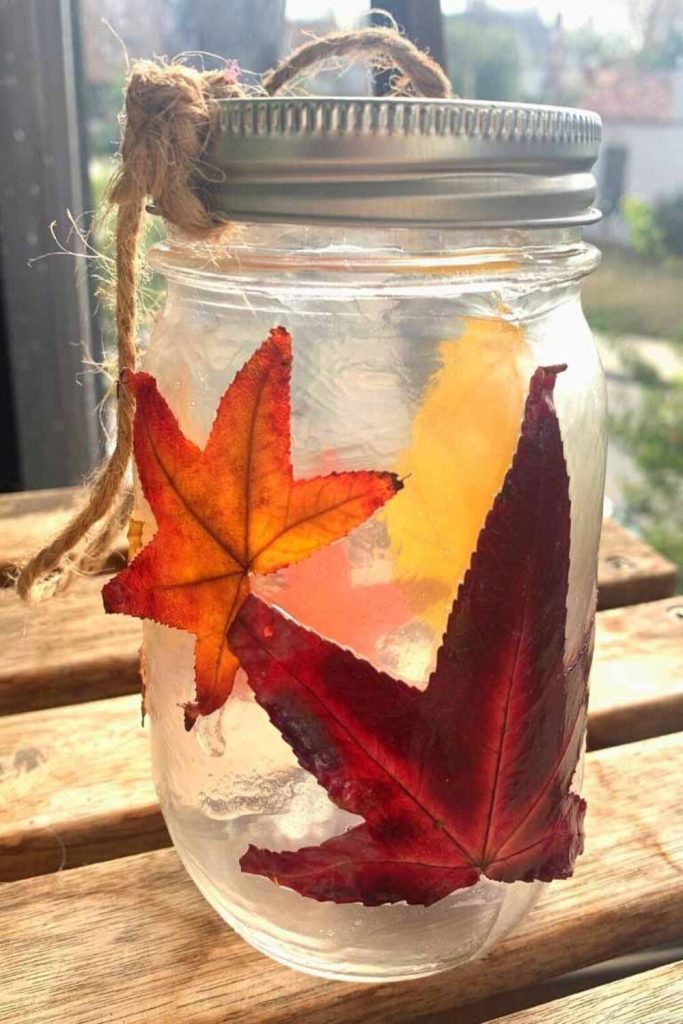 That golden hour walk yielded perfect leaves for this suspended stunner—a quart jar filled with water, orange and yellow foliage floating free, jute handle looped over a porch rail, backyard blurring behind. I froze the leaves first to preserve, avoiding sogginess from past floats. Fall mason jar crafts at heart, it’s a serene upcycled twist on fairy light mason jars—add LEDs for night. Sways gently, like wind chimes of light. Leafy experiments? Yours next!