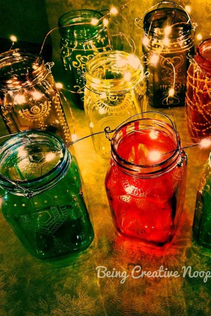 I used to draw henna. I had to paint the designs on jars. This group of bright jars lights up my door. It looks like a party. I painted about twelve jars. They are green, red, and blue. I drew swirling shapes (mandalas). I used acrylic paint. Then I sealed them with clear coat. Fairy lights are inside. They shine through the designs. I hung them with wire hooks. This makes them easy to swap. They look like the boho lights from last summer. My paint chipped before. I now use glass paint. It lasts longer. They start fun talks at dinner. They spread light like rainbows. They are perfect for lights all year. Have you painted jars? Tell me your best designs!