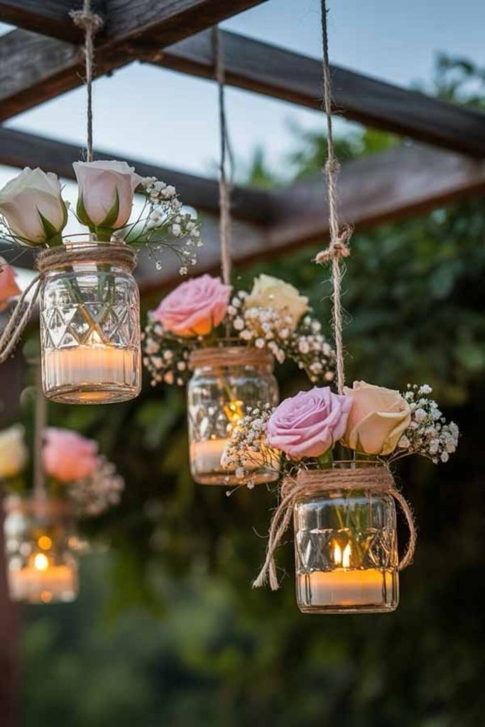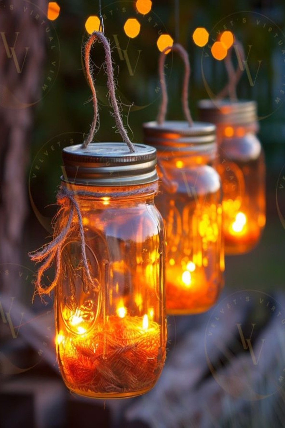 Those lazy evenings stringing jute around jars take me back to beach bonfires—three suspended in a row, rough twine wrapping the glass, stuffed with orange fairy lights and dried feathers for a nomadic glow against twilight trees. I knotted the twine securely after one unraveled mid-hang, a rookie slip long ago. This boho mason jar lights vibe screams upcycled mason jar ideas, portable for tents or pergolas. The warm tones blend with sunsets, creating pockets of light that feel alive. Sustainable and cheap—jute’s my forever fave. Swinging in the breeze, pure poetry. Your hanging hack?