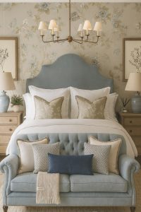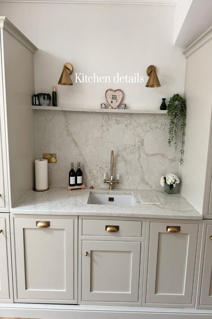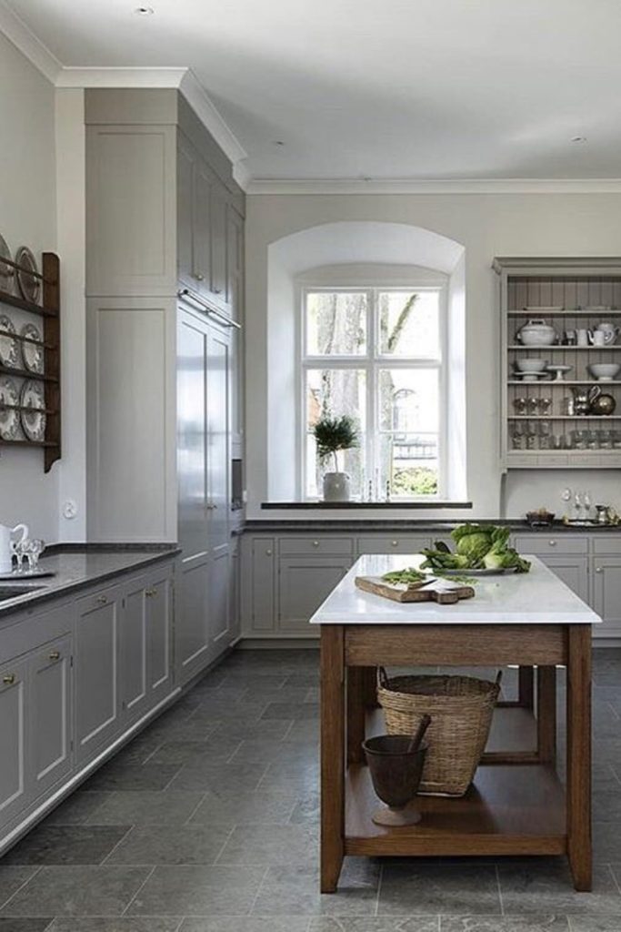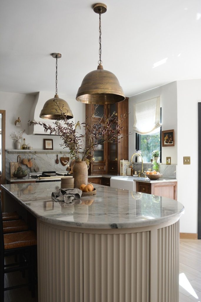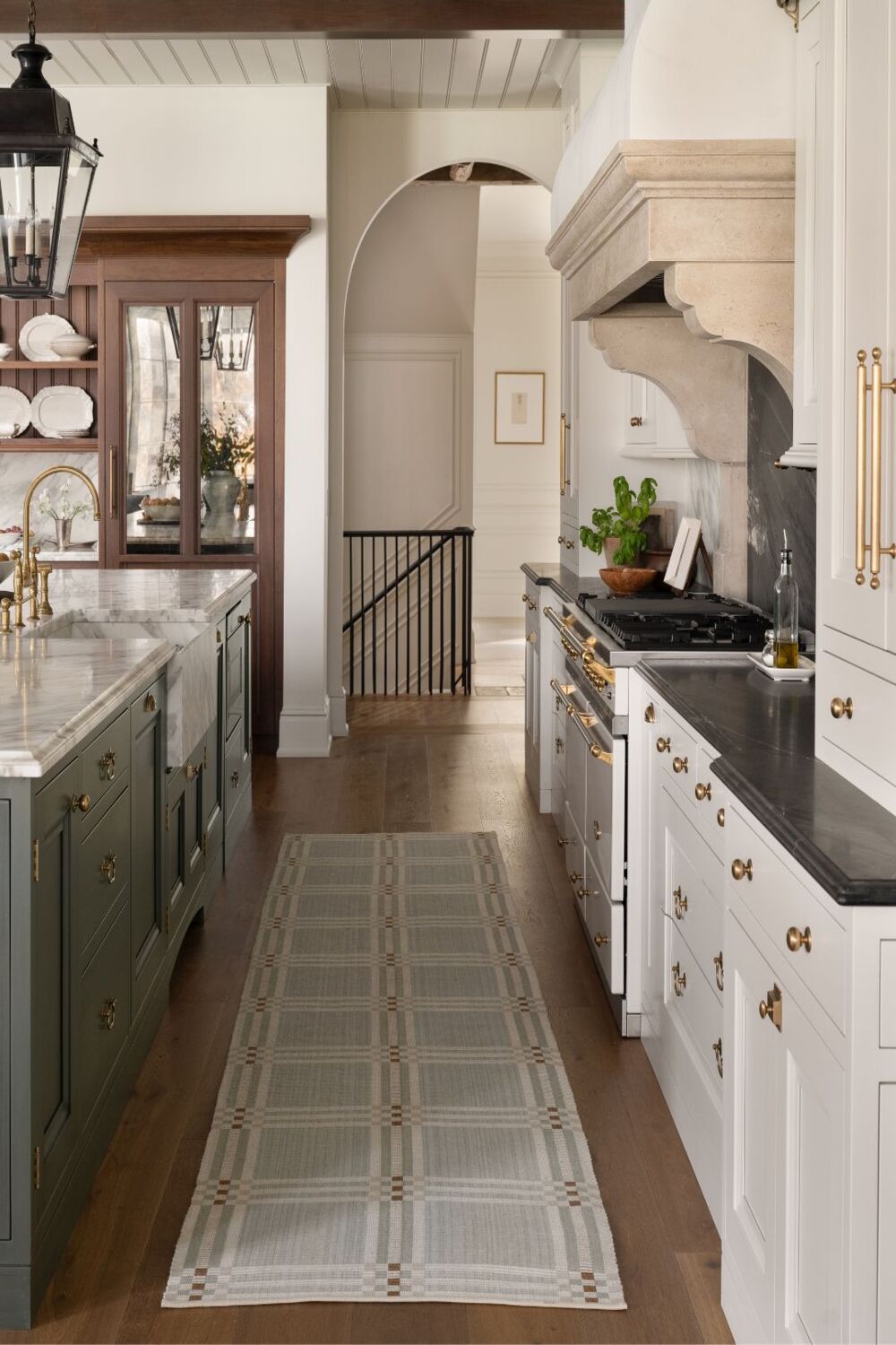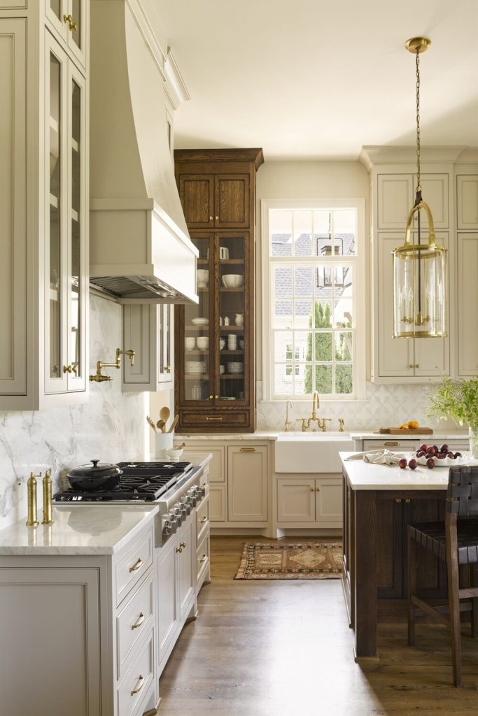 This French provincial kitchen feels timeless and soft. The creamy cabinets with pretty details look lovely beside the gray island. The marble top and vintage light add a touch of class. Green plants bring freshness and life. I love how it feels fancy but still cozy. Want this French feel? Pick gentle tones and elegant details. Share your favorite French decor tips below!