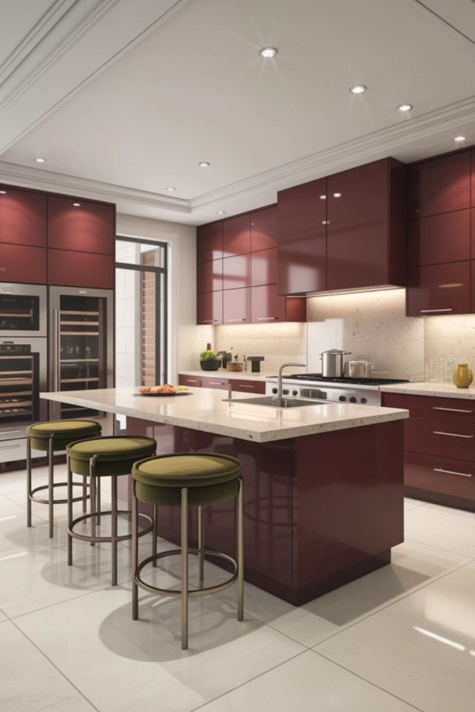 This Mediterranean kitchen feels bright and full of life. The terracotta walls and wooden island make it warm and cozy. The painted tiles add fun color and charm. Open shelves with handmade pottery give it a real European touch. The reclaimed wood makes it eco-friendly too. The soft lights add a warm glow. Want this sunny look? Mix bright tiles with wood textures. Share your Mediterranean ideas in the comments!