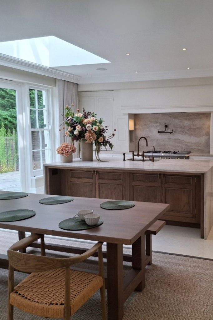 This minimalist European kitchen feels fresh and quiet. The white cabinets and oak counters make it bright. The gray tiles and woven details add warmth. The open shelves with simple dishes show 2025’s cozy trend. It’s clean, pretty, and calm. Want this easy look? Keep soft lines and natural touches. Share your minimalist kitchen ideas in the comments and inspire others with this timeless peace!