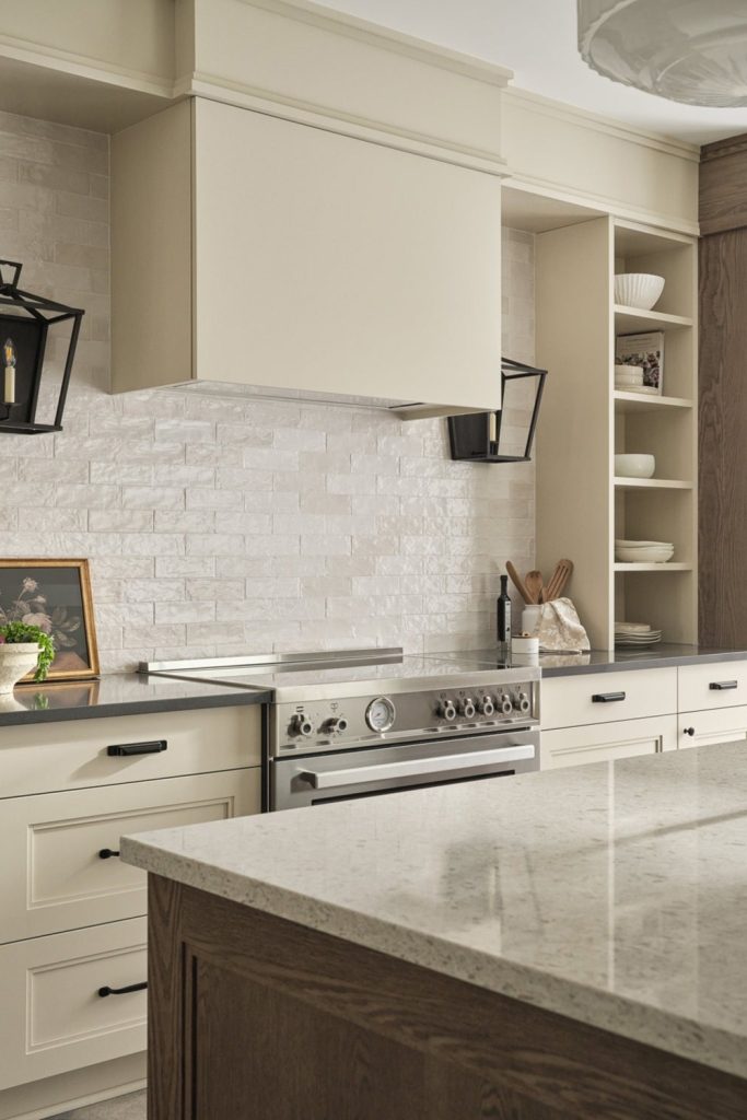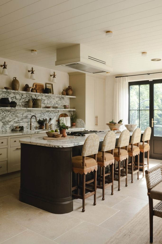 This French country kitchen feels soft and happy. The cream cabinets and wood island give a warm, homey feel. The brass taps and open shelves with china add a sweet touch. The beige tones fit 2025’s cozy, simple look. Want this inviting style? Add rustic details and warm shades. Share your French country ideas in the comments and make your own countryside kitchen!
