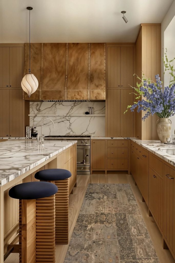 This Scandinavian kitchen feels light and calm. The oak cabinets and white walls make it bright and clean. The bamboo counter shows 2025’s eco-friendly trend. The soft gray fabrics add warmth. It’s simple, fresh, and welcoming. Want this peaceful look? Use clean shapes and natural things. Share your Scandinavian kitchen ideas in the comments and inspire others with your calm, easy style!