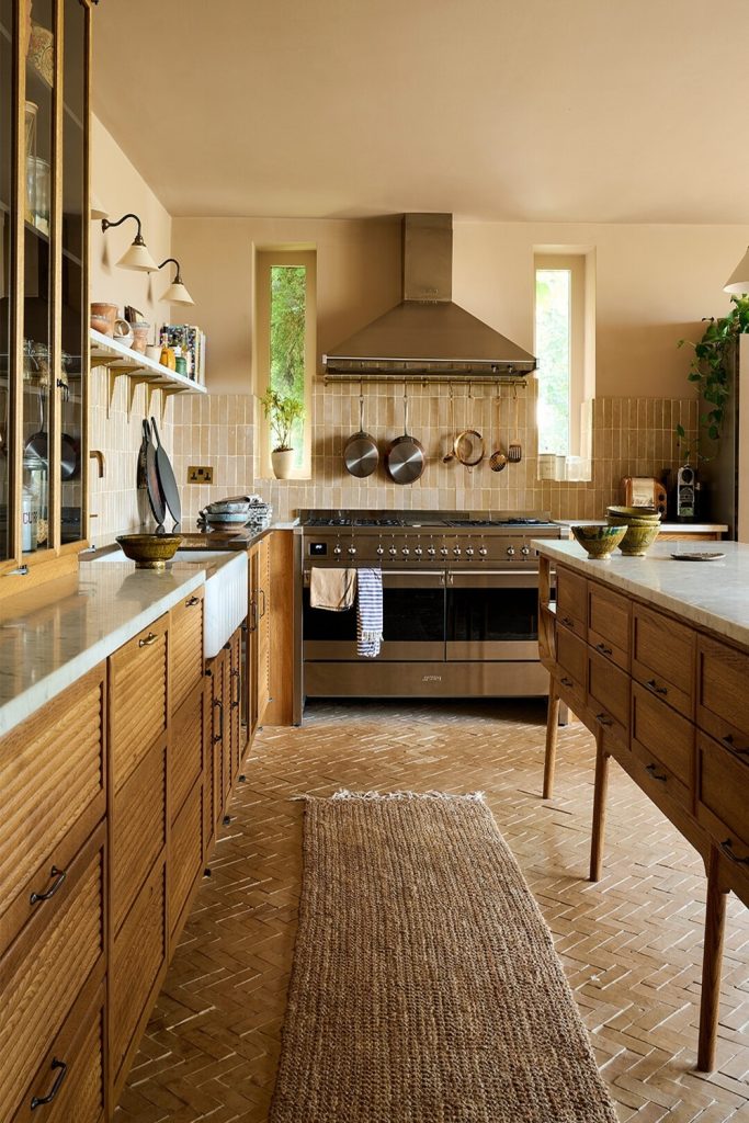 This Scandinavian kitchen shows cozy minimalism in the best way. The white walls and light oak cabinets make it bright and open. Black handles add a modern twist. The wooden top fits 2025’s eco trends and feels warm. Green dishes pop against the pale tones. It proves that European kitchens can be simple and stylish too. Try minimalist decor and tell me how it changes your kitchen!