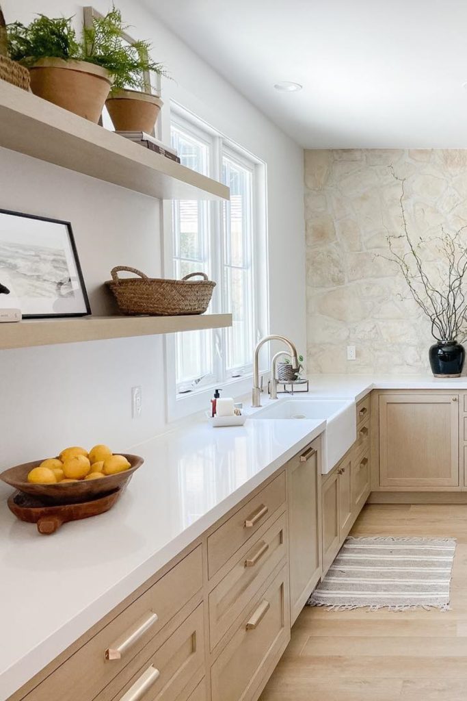This farmhouse kitchen feels simple and warm. White walls and wooden beams make it calm and homey. Shaker cabinets and bamboo tops keep it green and stylish. I love the open shelves showing handmade bowls. Linen curtains fit 2025’s natural trend. Want this look? Keep things simple and add warm touches. Share your farmhouse kitchen ideas in the comments!