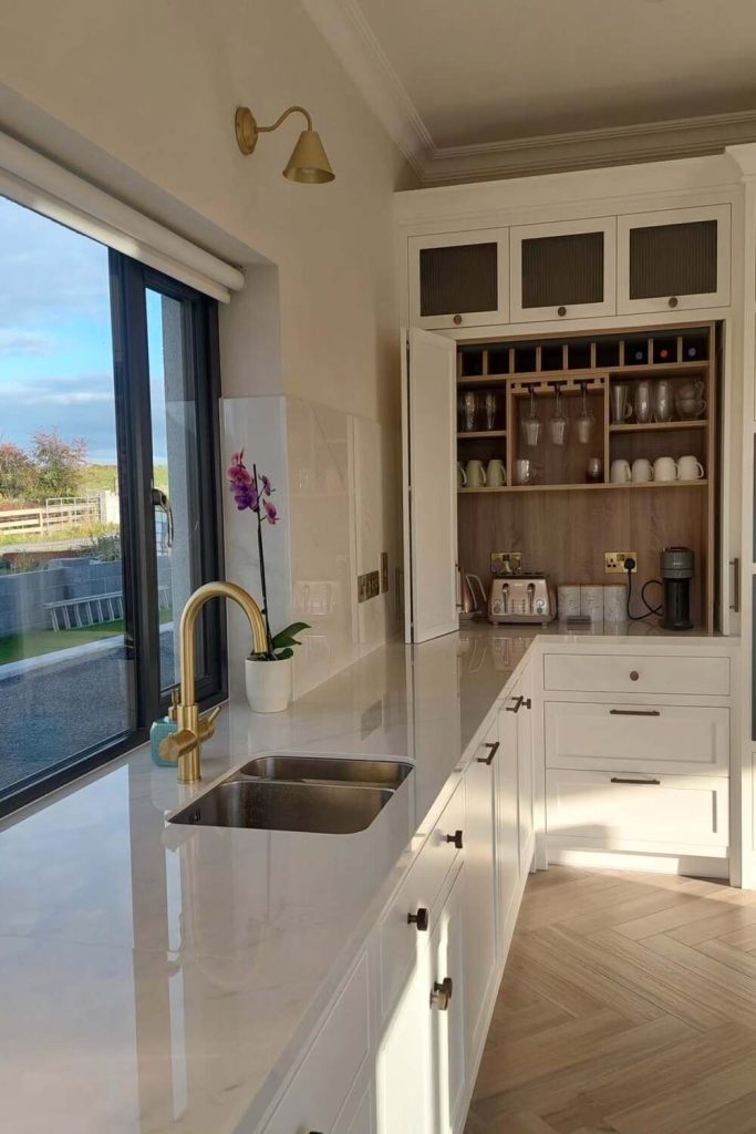 This English cottage kitchen feels sweet and welcoming. The pale blue cabinets and brass handles bring vintage charm. The wooden top feels natural and fits the open shelves. The floral curtains add a fun and cozy touch that suits 2025’s soft decor style. This European-style kitchen feels relaxed but classy. Want to try it? Use soft colors and warm textures. Share your cottage kitchen ideas below!