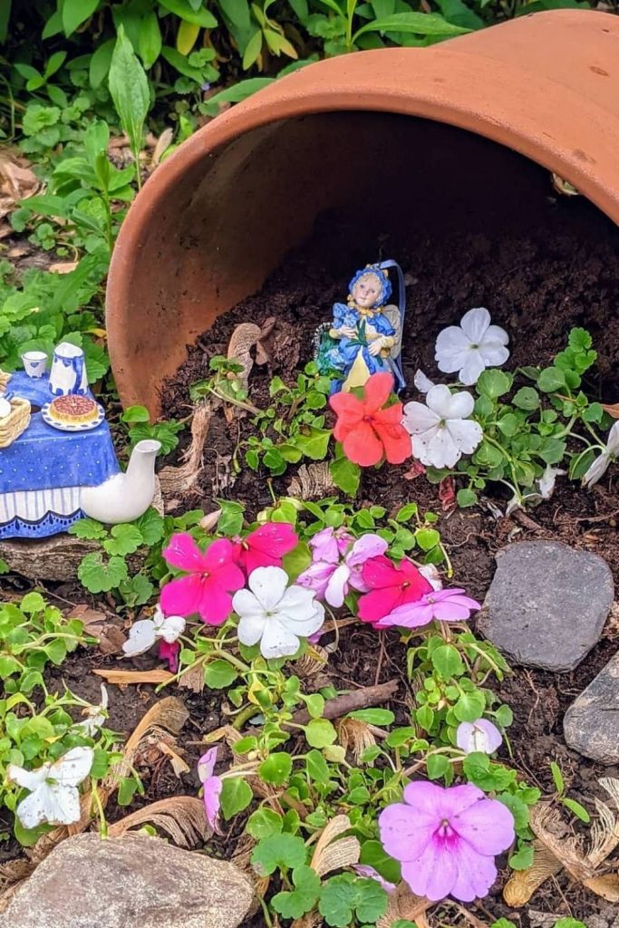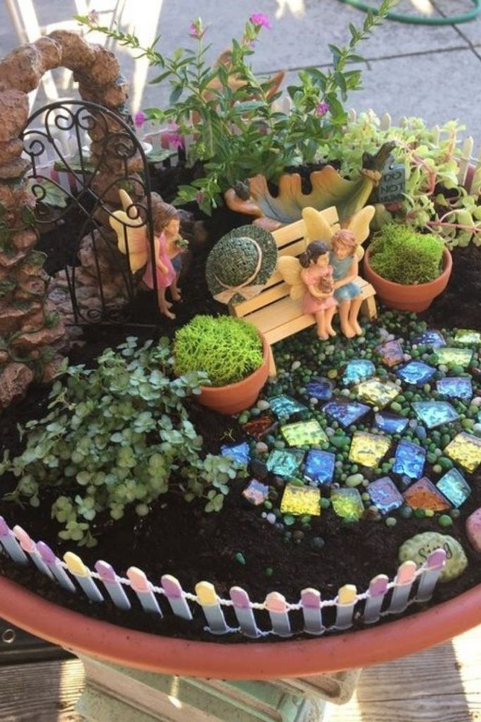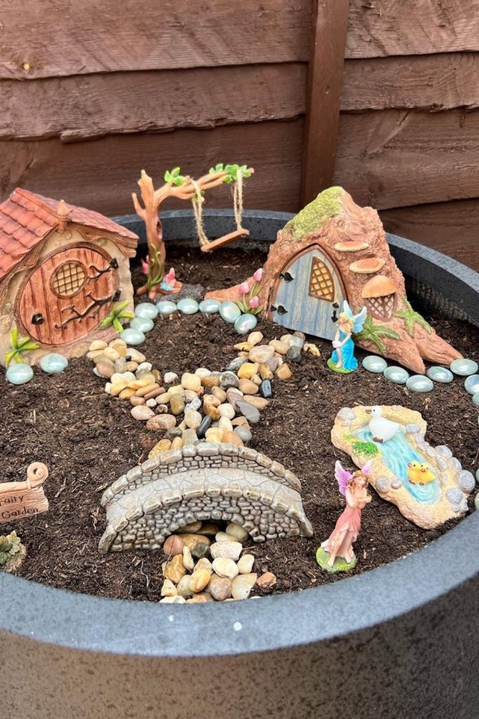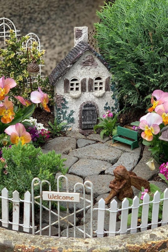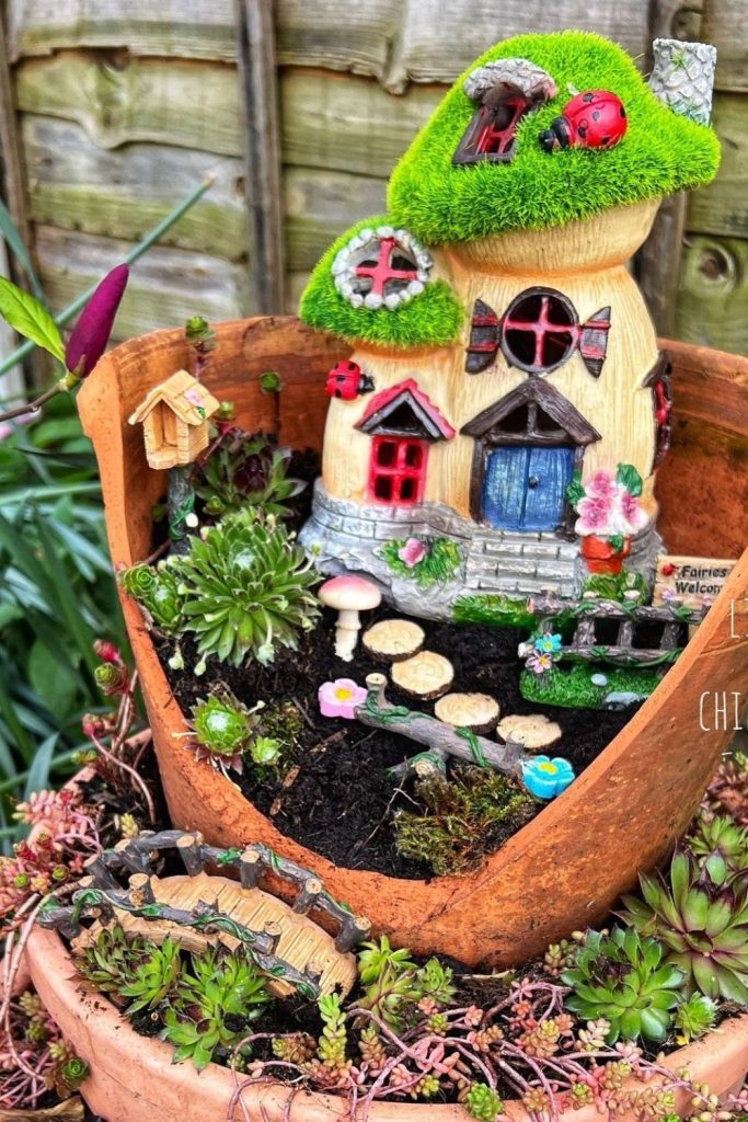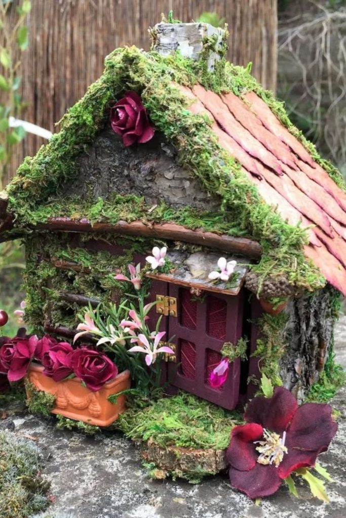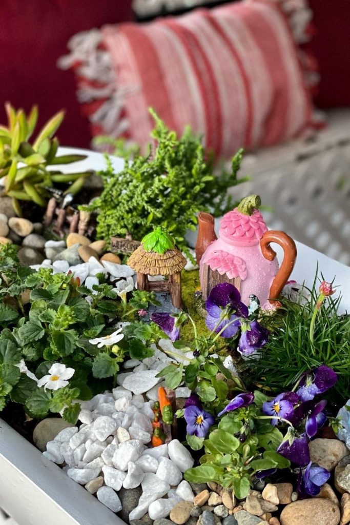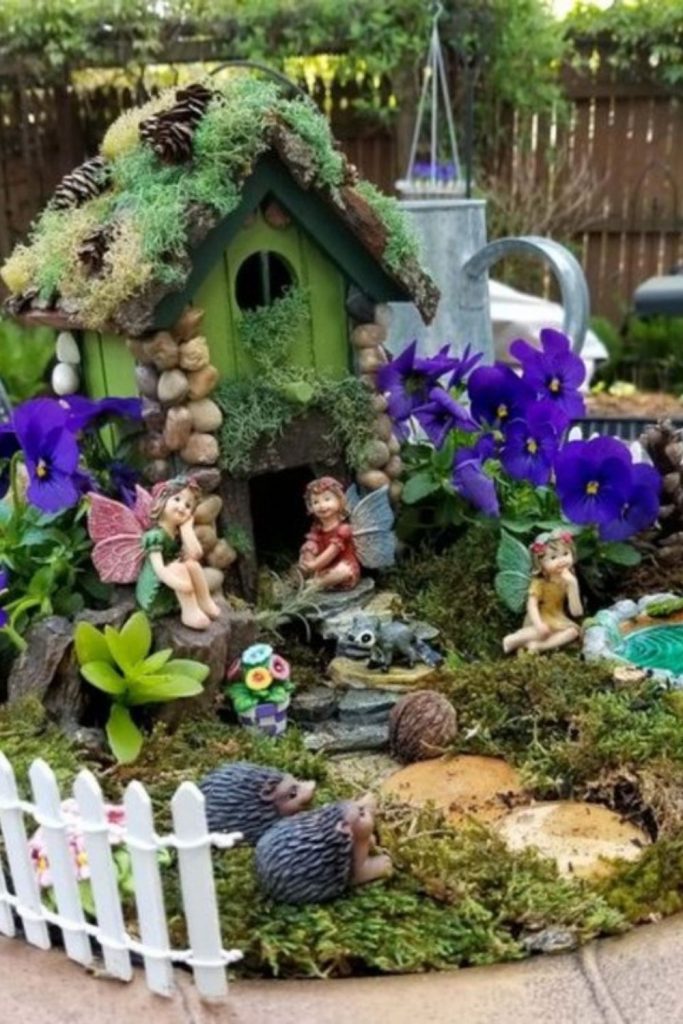 This fairy garden feels cozy and bright. A small stone house sits among colorful flowers and a tiny wooden fence. Warm orange and purple shades bring a soft fall touch. Natural textures and cute details make it stand out. It’s perfect for a small garden or porch nook. Add a small fairy swing for extra magic. Try this idea and share your garden decor style!