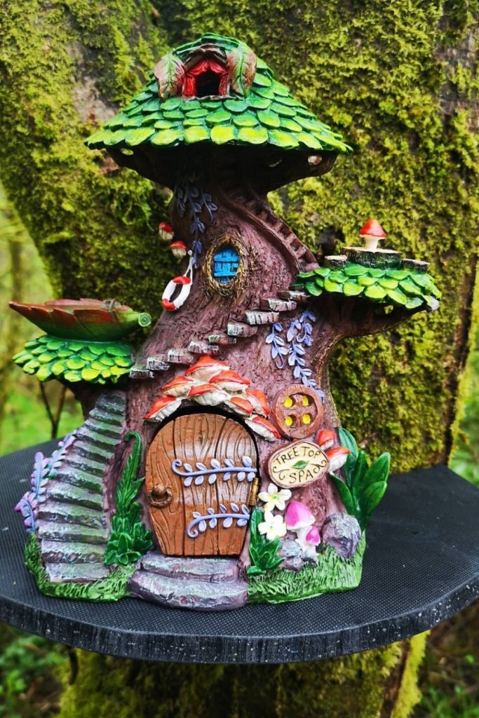 This fairy garden treehouse feels cozy and full of magic. A tiny wooden house sits on small branches with moss and flowers around it. Soft lights make it glow in the evening. Warm brown and gold shades give it a fall feel. It’s perfect for a garden or small patio corner. Add a small ladder for extra charm. Try this cute idea and share your fairy garden tips!