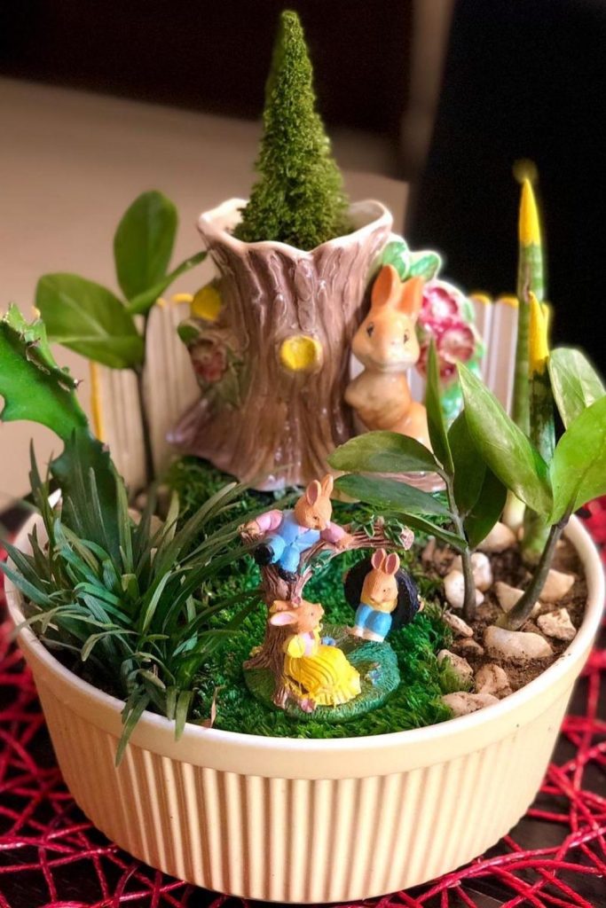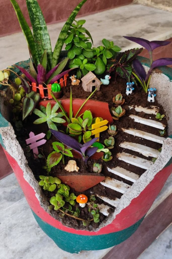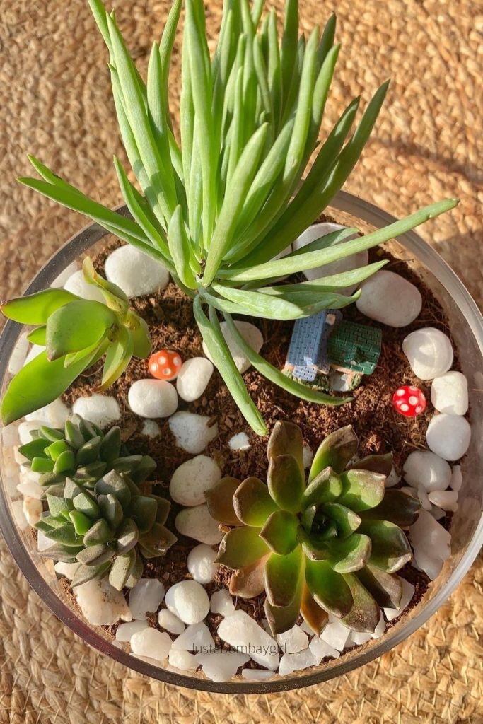 This teacup fairy garden looks sweet and full of charm. A vintage cup holds tiny plants, a small ladder, and a pebble path. It feels magical and cozy at the same time. Soft green and pink shades bring a warm touch. You can turn any old cup into a tiny fairy world. It fits well on a desk or balcony. Add a small fairy figure for extra fun. Try it out and share your ideas!
