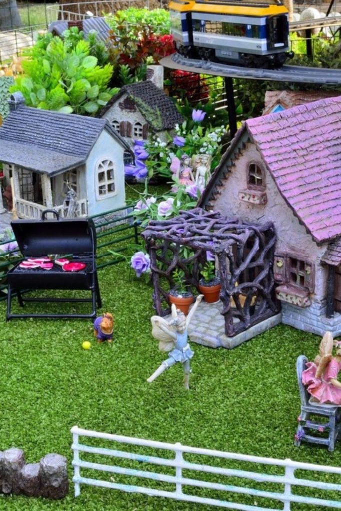 This fairy garden feels calm and bright. A small waterfall runs into a tiny pond with green ferns and a neat bridge. Soft blues and greens add a fresh, relaxing look. The water gives life and gentle sound to the space. It fits nicely in a shady garden spot. Add a small fairy boat to make it fun. Try this idea and share your favorite garden touches!