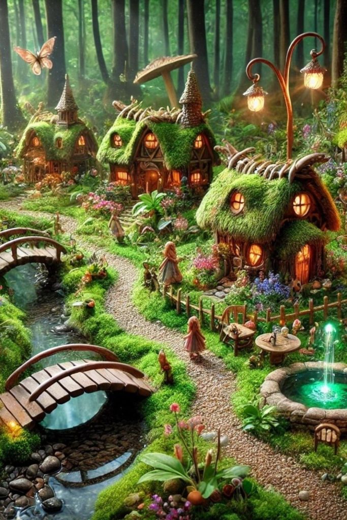 This fairy garden village looks calm and full of charm. Small cottages sit beside a smooth path with soft ferns and gentle lights. Warm greens and amber tones give it a cozy fall touch. The scene feels like a sweet, tiny world. It fits well in a shady garden corner. Add a little fairy well for more fun. Try this cute idea and share your garden style!