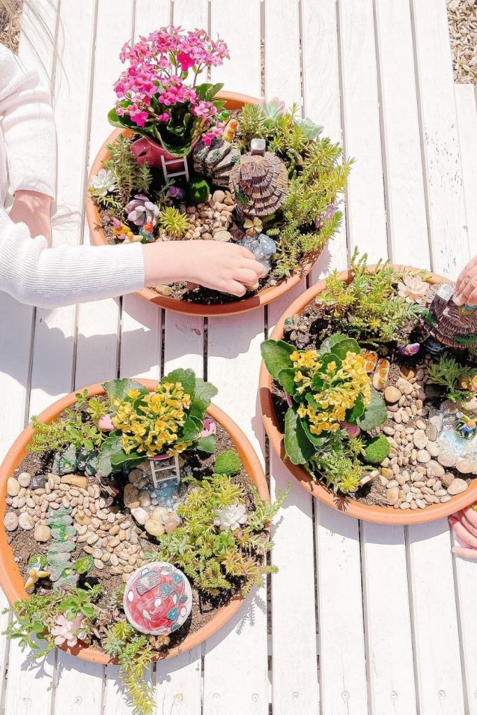 This planter fairy garden looks cozy and fun. A rustic pot holds tiny houses, green plants, and a small stone path. Soft orange and brown colors make it feel warm for fall. Planters keep fairy gardens easy to move and enjoy anywhere. It fits nicely on a porch or balcony. Add a tiny fairy swing for extra charm. Try it and share your best garden ideas!