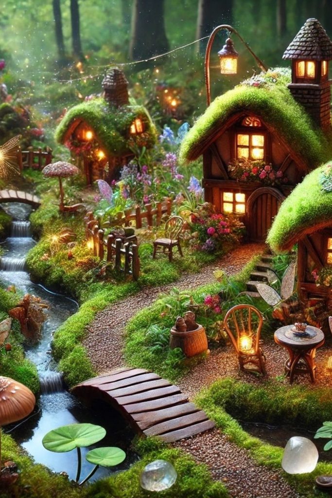 This fairy garden looks like it came from a story. Small wooden houses with moss roofs sit among green plants and glowing lights. A stone path adds charm, and purple flowers bring soft color for fall. The setup feels warm, simple, and full of nature. It fits a small patio or garden nook. Add your own tiny fairy houses and share your garden ideas!