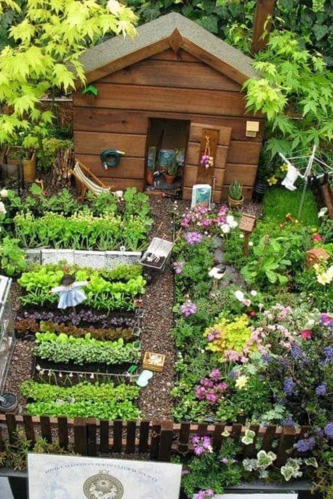 This rustic fairy garden feels warm and full of charm. A small log cabin sits among flowers, pebbles, and a wooden fence. Soft brown and gold tones give it a cozy fall look. Natural touches make it feel simple and real. This setup works well in a small garden nook. Add a little fairy light for extra glow. Try it out and share your garden ideas!