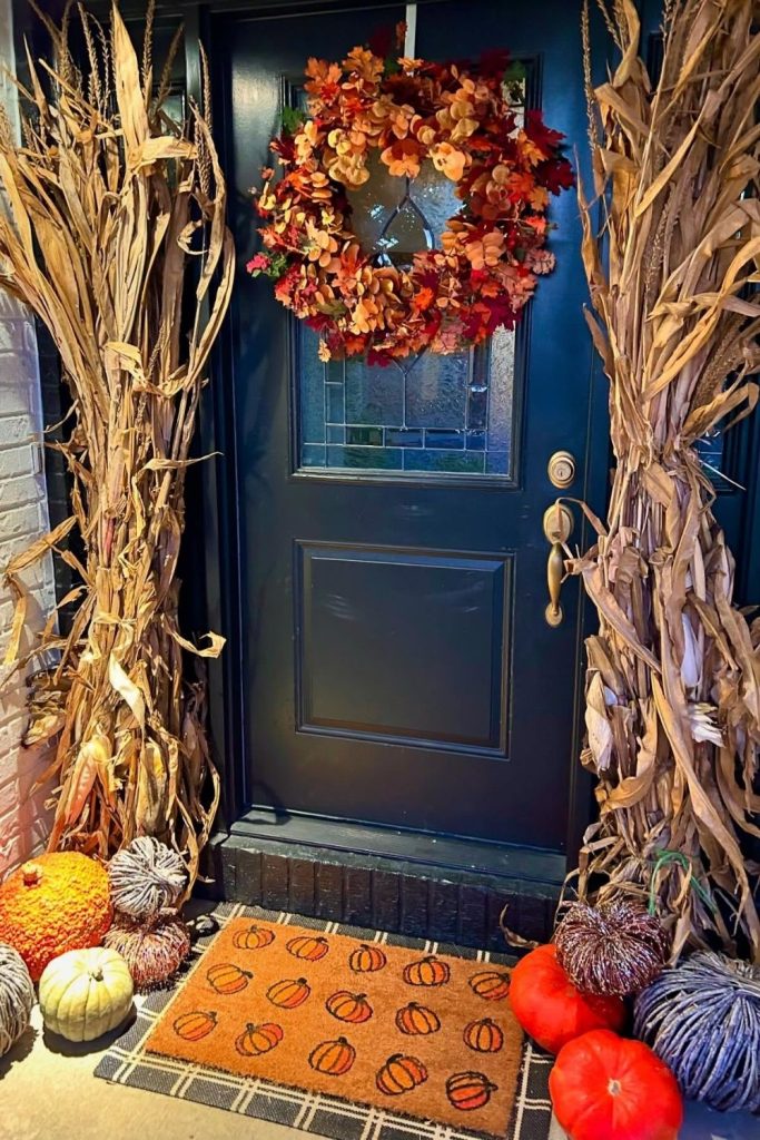 This fall porch is clean and cozy. A black door stands out on a plain wall. Two dark pots hold bright, orange mums. A small wreath with eucalyptus and dried wheat adds a soft touch. The look is simple and fresh. I like how this style is easy and pretty. Want to try a modern fall porch? Use soft colors and keep it simple. Share your best fall ideas below!