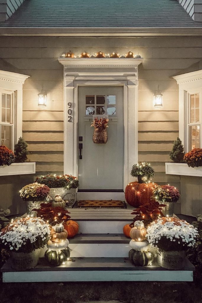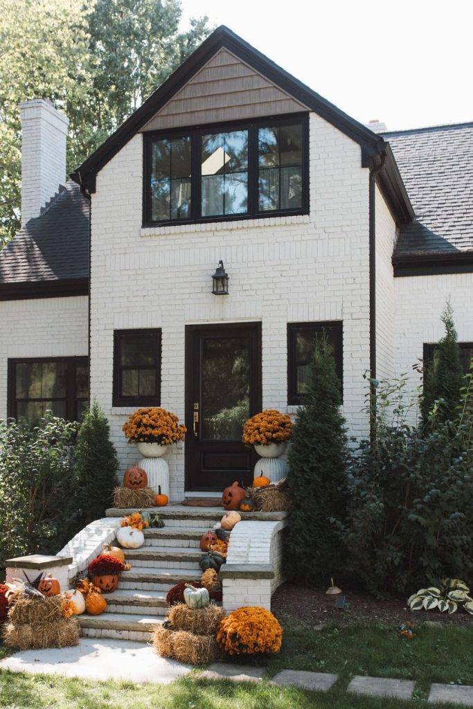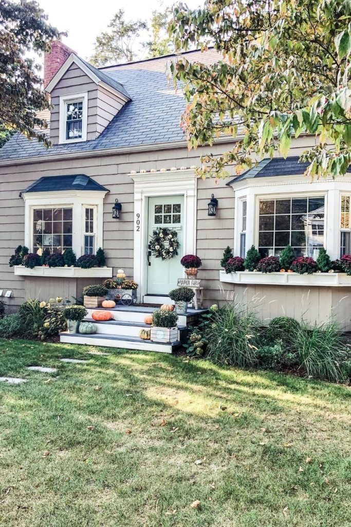 This porch shows classic fall style. White pumpkins sit by green plants on both sides of a black door. A jute rug adds warmth. A red berry wreath adds fall colors. This looks neat and friendly. It is good for anyone who wants a simple fall porch look. Use plain pumpkins for a classy touch. Want to make your curb look better? Share this on Pinterest and swap fall ideas!