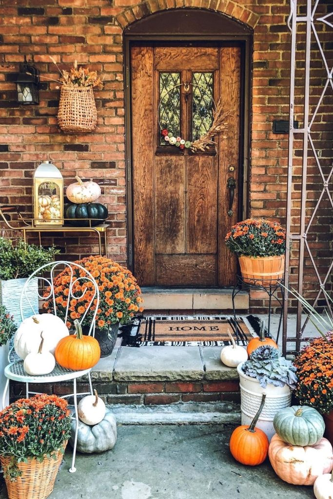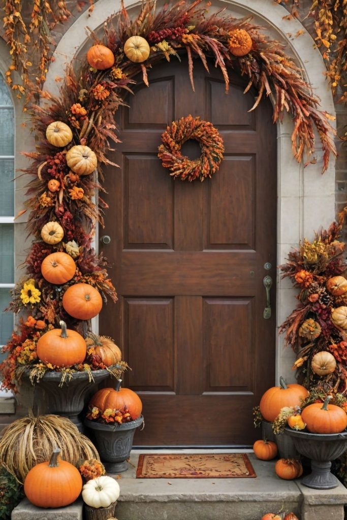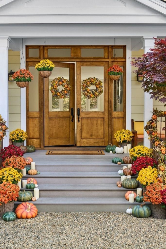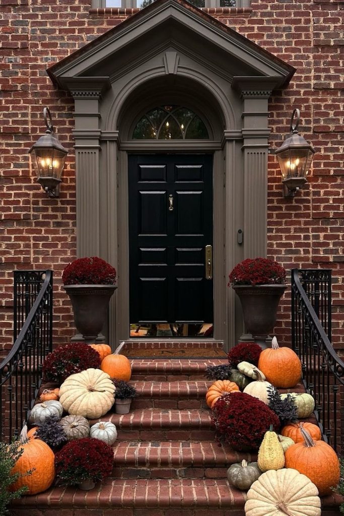 This porch feels calm and elegant. Two urns with deep red mums stand on each side of a sleek door. A garland with dried leaves hangs over the entry. A white pumpkin adds a fresh, modern touch. I like polished looks like this. It mixes fall charm and style. Classic planters give a timeless feel. This look is great for a chic fall update. Like elegant decor? Share on social media or tell us your porch tips!